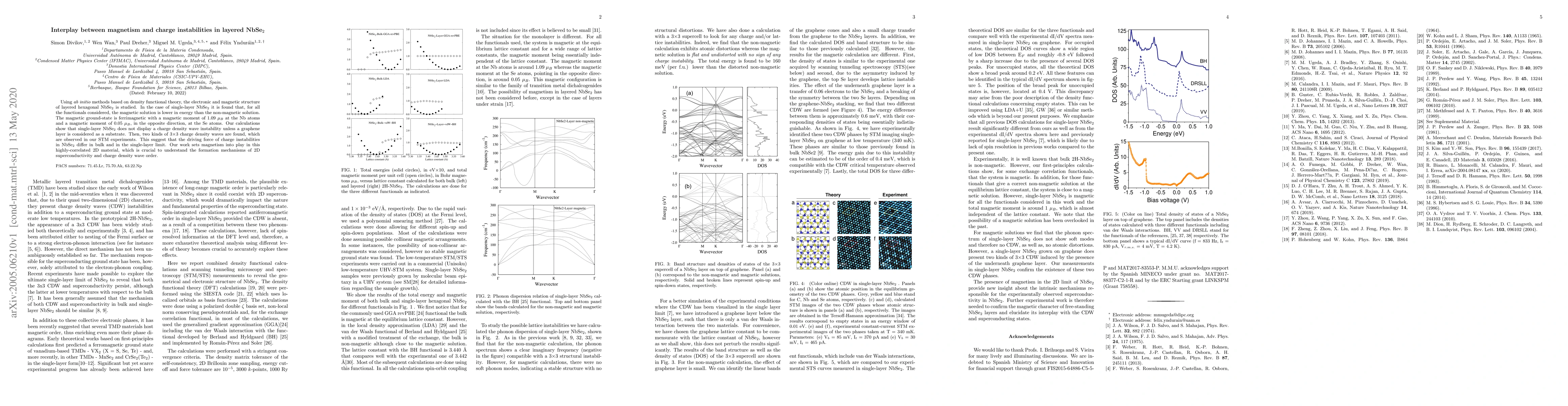 Using ab initio methods based on density functional theory, the electronic and magnetic structure of layered hexagonal NbSe$_{2}$ is studied. In the case of single-layer NbSe$_{2}$ it is found that, for all the functionals considered, the magnetic solution is lower in energy than the non-magnetic solution. The magnetic ground-state is ferrimagnetic with a magnetic moment of 1.09 $\mu_{B}$ at the Nb atoms and a magnetic moment of 0.05 $\mu_{B}$, in the opposite direction, at the Se atoms. Our calculations show that single-layer NbSe$_{2}$ does not display a charge density wave instability unless a graphene layer is considered as a substrate. Then, two kinds of 3$\times$3 charge density waves are found, which are observed in our STM experiments. This suggest that the driving force of charge instabilities in NbSe$_{2}$ differ in bulk and in the single-layer limit. Our work sets magnetism into play in this highly-correlated 2D material, which is crucial to understand the formation mechanisms of 2D superconductivity and charge density wave order.