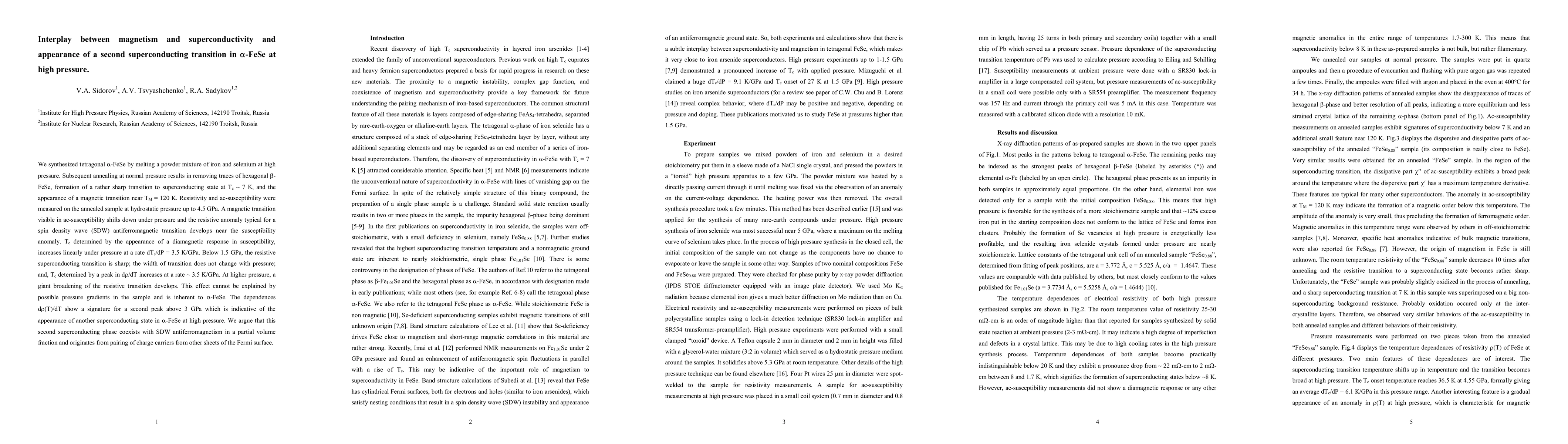 This study investigates the interplay between magnetism and superconductivity in alpha-FeSe under high pressure, revealing a sharp superconducting transition at Tc ~ 7 K and a magnetic transition near Tm = 120 K. A second superconducting phase emerges above 3 GPa, suggesting coexistence with spin density wave antiferromagnetism and originating from pairing of charge carriers from different Fermi surface sheets.