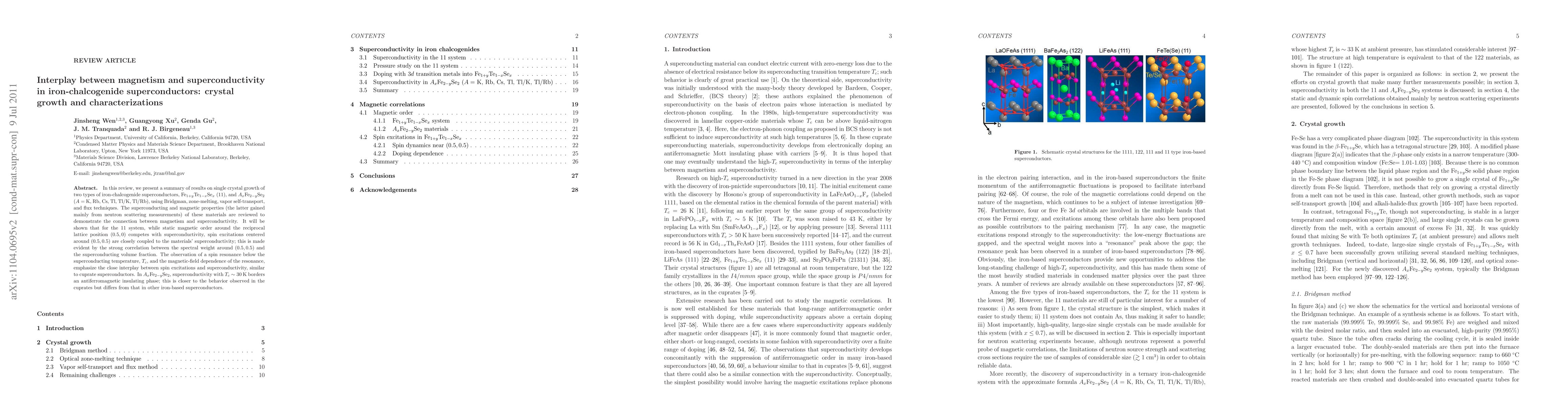 This review summarizes the growth and characterization of iron-chalcogenide superconductors, highlighting the interplay between magnetism and superconductivity. It reveals that spin excitations in Fe(1+y)Te(1-x)Se(x) are closely linked to superconductivity, while in A(x)Fe(2-y)Se(2), superconductivity borders an antiferromagnetic phase, akin to cuprate superconductors.