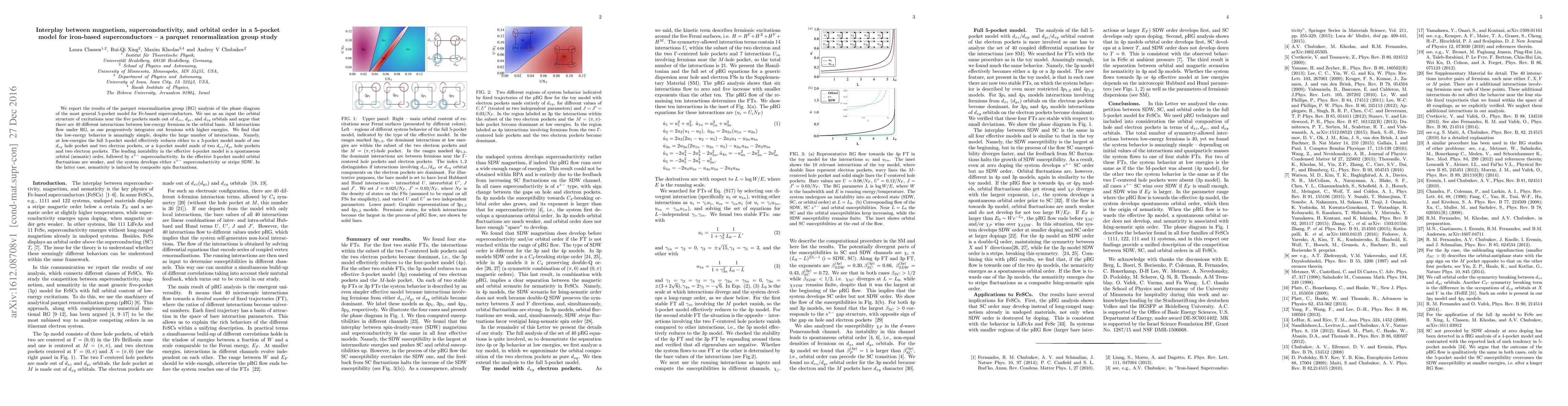 We report the results of the parquet renormalization group (RG) analysis of the phase diagram of the most general 5-pocket model for Fe-based superconductors. We use as an input the orbital structure of excitations near the five pockets made out of $d_{xz}$, $d_{yz}$, and $d_{xy}$ orbitals and argue that there are 40 different interactions between low-energy fermions in the orbital basis. All interactions flow under RG, as one progressively integrates out fermions with higher energies. We find that the low-energy behavior is amazingly simple, despite the large number of interactions. Namely, at low-energies the full 5-pocket model effectively reduces either to a 3-pocket model made of one $d_{xy}$ hole pocket and two electron pockets, or a 4-pocket model made of two $d_{xz}/d_{yz}$ hole pockets and two electron pockets. The leading instability in the effective 4-pocket model is a spontaneous orbital (nematic) order, followed by $s^{+-}$ superconductivity. In the effective 3-pocket model orbital fluctuations are weaker, and the system develops either $s^{+-}$ superconductivity or stripe SDW. In the latter case, nematicity is induced by composite spin fluctuations.
