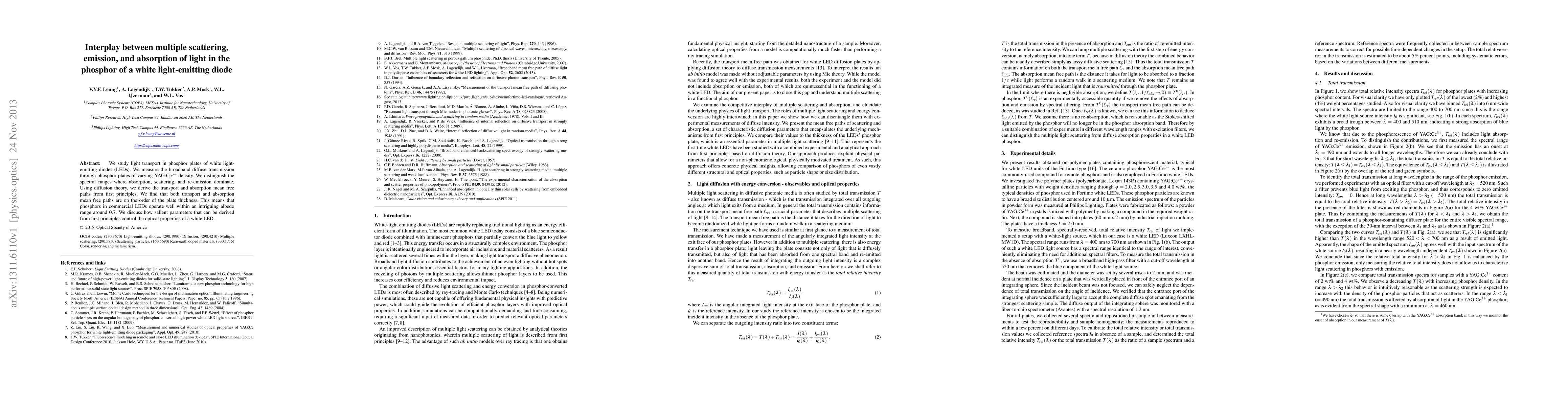 We study light transport in phosphor plates of white light-emitting diodes (LEDs). We measure the broadband diffuse transmission through phosphor plates of varying YAG:Ce$^{3+}$ density. We distinguish the spectral ranges where absorption, scattering, and re-emission dominate. Using diffusion theory, we derive the transport and absorption mean free paths from first principles. We find that both transport and absorption mean free paths are on the order of the plate thickness. This means that phosphors in commercial LEDs operate well within an intriguing albedo range around 0.7. We discuss how salient parameters that can be derived from first principles control the optical properties of a white LED.