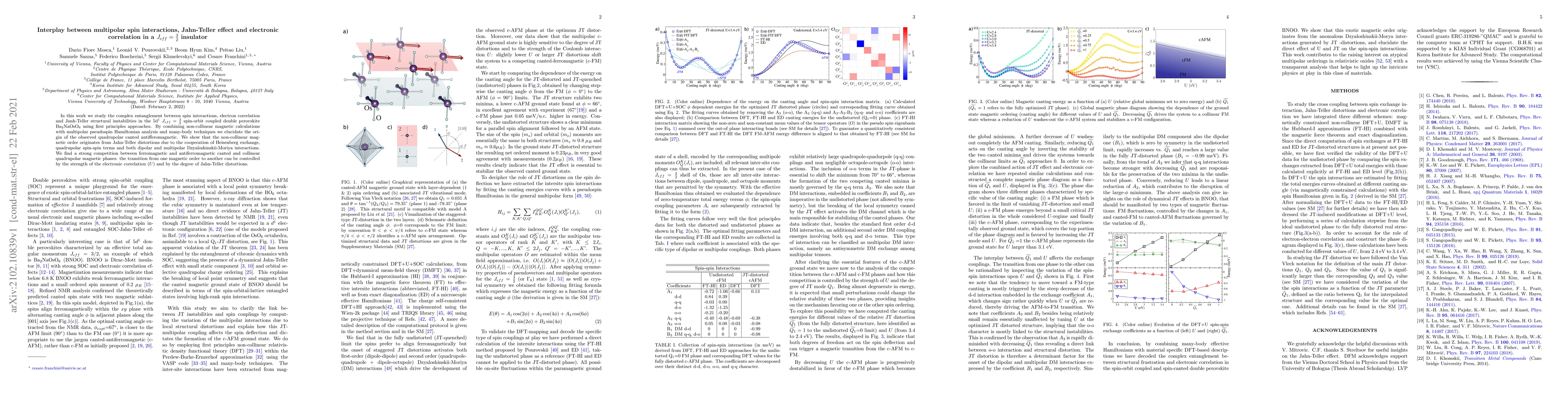 In this work we study the complex entanglement between spin interactions, electron correlation and Janh-Teller structural instabilities in the 5d$^1$ $J_{eff}=\frac{3}{2}$ spin-orbit coupled double perovskite $\rm Ba_2NaOsO_6$ using first principles approaches. By combining non-collinear magnetic calculations with multipolar pseudospin Hamiltonian analysis and many-body techniques we elucidate the origin of the observed quadrupolar canted antifferomagnetic. We show that the non-collinear magnetic order originates from Jahn-Teller distortions due to the cooperation of Heisenberg exchange, quadrupolar spin-spin terms and both dipolar and multipolar Dzyaloshinskii-Moriya interactions. We find a strong competition between ferromagnetic and antiferromagnetic canted and collinear quadrupolar magnetic phases: the transition from one magnetic order to another can be controlled by the strength of the electronic correlation ($U$) and by the degree of Jahn-Teller distortions.