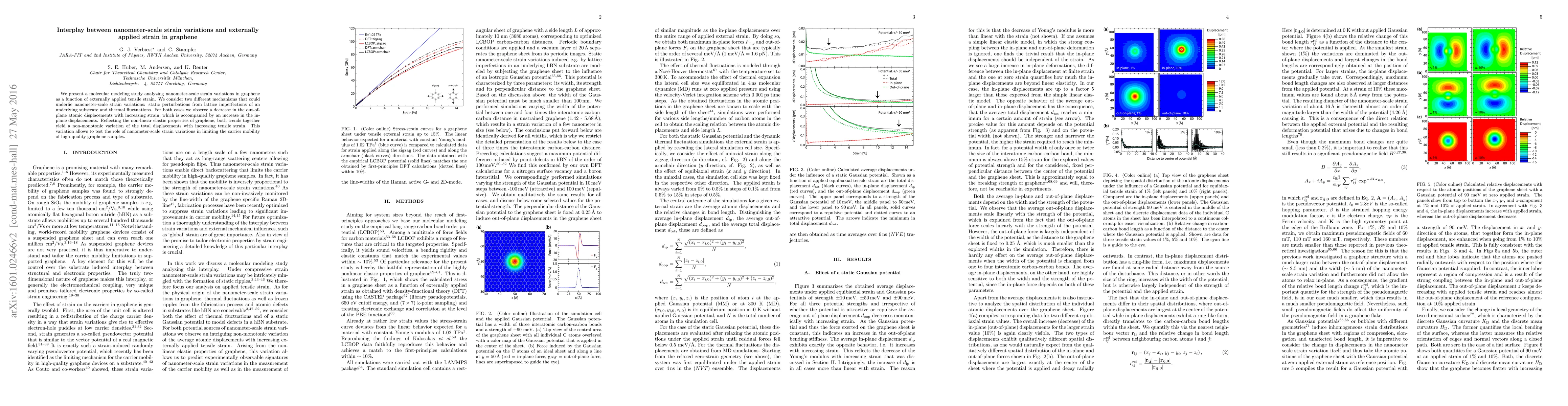 This study uses molecular modeling to investigate how nanometer-scale strain variations in graphene respond to externally applied tensile strain, considering substrate imperfections and thermal fluctuations. The results show a non-monotonic variation in total displacements, highlighting the interplay between these strains and their impact on carrier mobility.