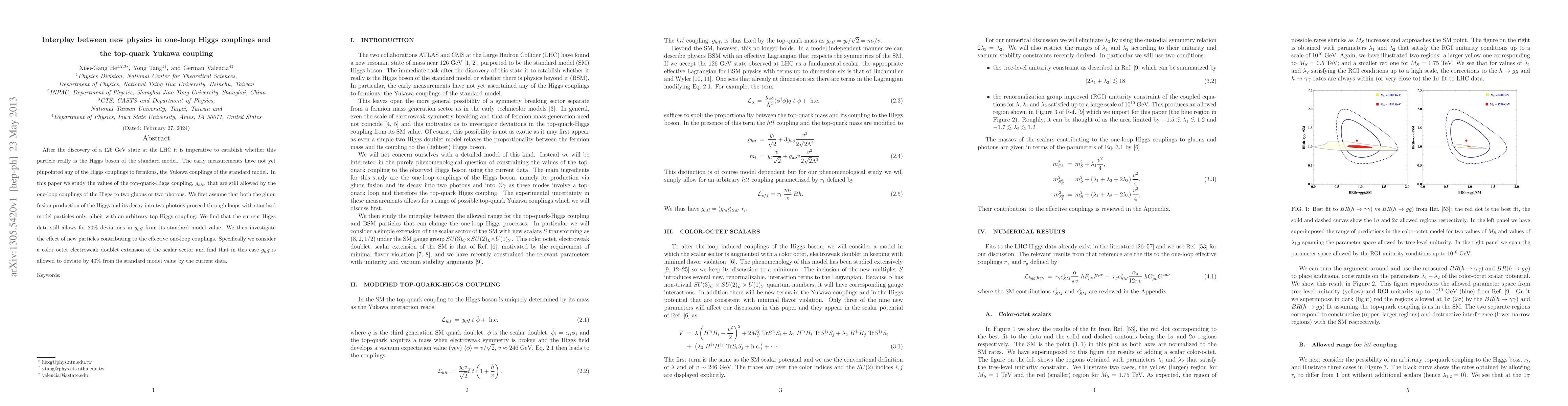 After the discovery of a 126 GeV state at the LHC it is imperative to establish whether this particle really is the Higgs boson of the standard model. The early measurements have not yet pinpointed any of the Higgs couplings to fermions, the Yukawa couplings of the standard model. In this paper we study the values of the top-quark-Higgs coupling, $g_{ht\bar{t}}$, that are still allowed by the one-loop couplings of the Higgs to two gluons or two photons. We first assume that both the gluon fusion production of the Higgs and its decay into two photons proceed through loops with standard model particles only, albeit with an arbitrary top-Higgs coupling. We find that the current Higgs data still allows for 20% deviations in $g_{ht\bar{t}}$ from its standard model value. We then investigate the effect of new particles contributing to the effective one-loop couplings. Specifically we consider a color octet electroweak doublet extension of the scalar sector and find that in this case $g_{ht\bar{t}}$ is allowed to deviate by 40% from its standard model value by the current data.