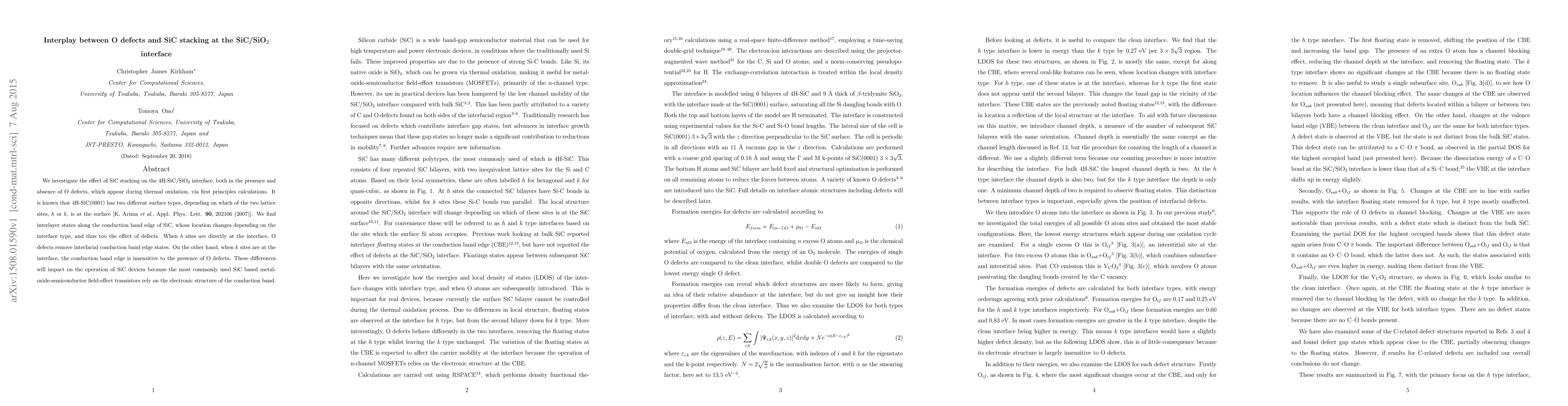 This study explores how SiC stacking influences the 4H-SiC/SiO$_2$ interface, revealing that O defects affect the conduction band edge differently depending on whether $h$ or $k$ lattice sites are at the interface. These findings have implications for the electronic properties of SiC-based devices.
