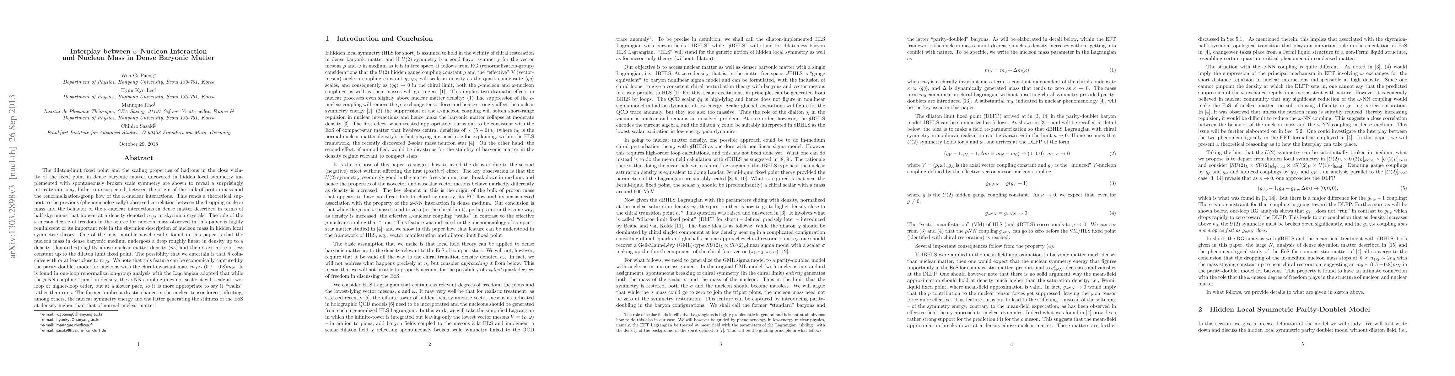 This paper explores the interplay between the ω-nucleon interaction and nucleon mass in dense baryonic matter, revealing a complex relationship between the origin of proton mass and the renormalization-group flow of ω-nuclear interactions. It finds that nucleon mass drops linearly with density up to a critical point, after which it stabilizes, suggesting a connection to the behavior of half skyrmions in skyrmion crystals.