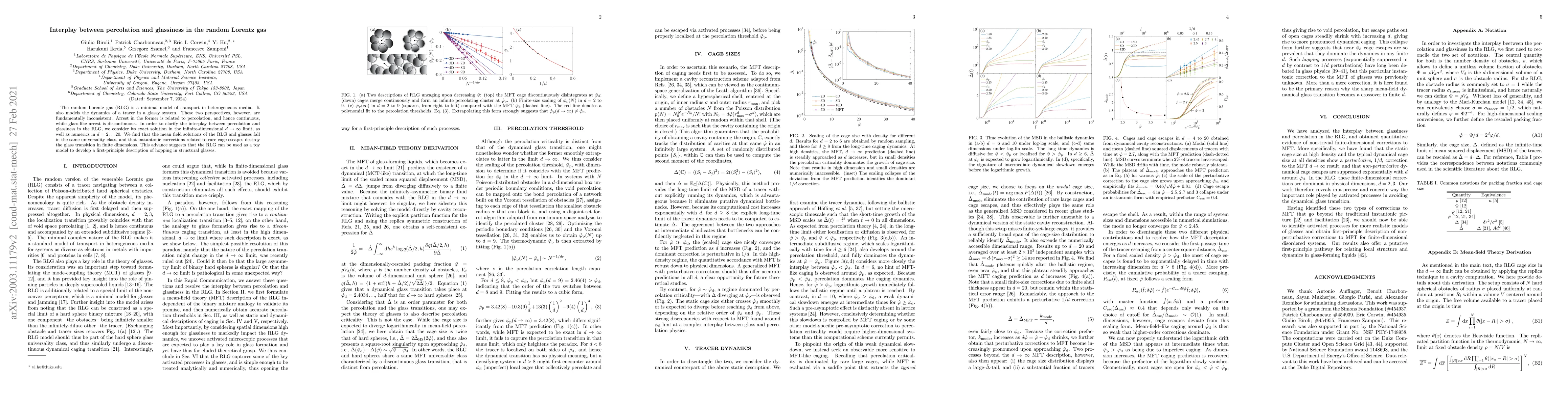 The random Lorentz gas (RLG) is a minimal model of transport in heterogeneous media. It also models the dynamics of a tracer in a glassy system. These two perspectives, however, are fundamentally inconsistent. Arrest in the former is related to percolation, and hence continuous, while glass-like arrest is discontinuous. In order to clarify the interplay between percolation and glassiness in the RLG, we consider its exact solution in the infinite-dimensional $d\rightarrow\infty$ limit, as well as numerics in $d=2\ldots 20$. We find that the mean field solutions of the RLG and glasses fall in the same universality class, and that instantonic corrections related to rare cage escapes destroy the glass transition in finite dimensions. This advance suggests that the RLG can be used as a toy model to develop a first-principle description of hopping in structural glasses.