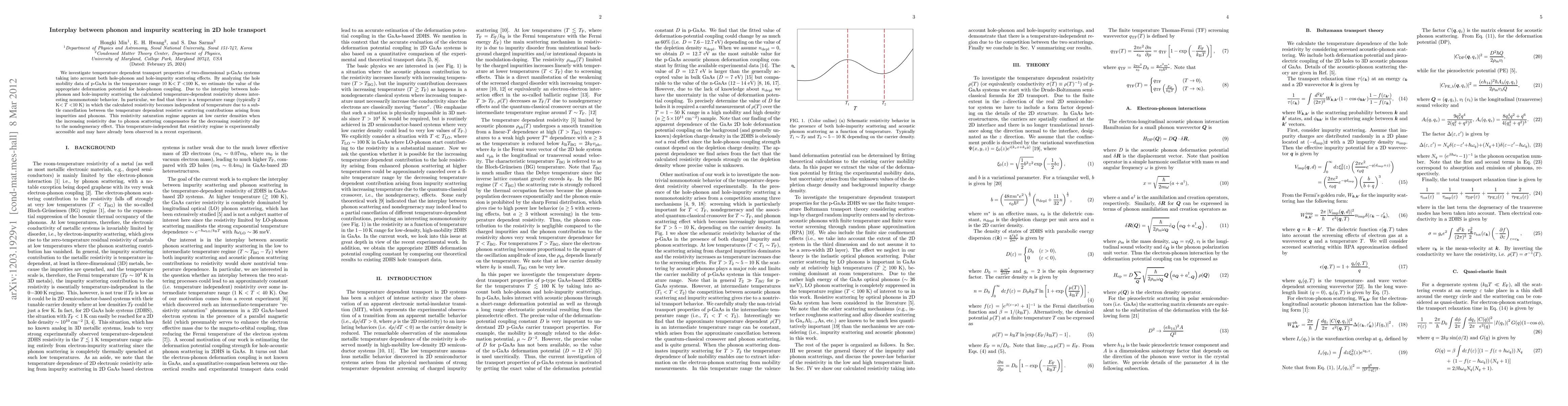 This study investigates the temperature-dependent transport properties of 2D p-GaAs systems, focusing on the interplay between hole-phonon and hole-impurity scattering. The research reveals a temperature-independent resistivity regime at low carrier densities due to a cancellation between resistive contributions from phonons and impurities.