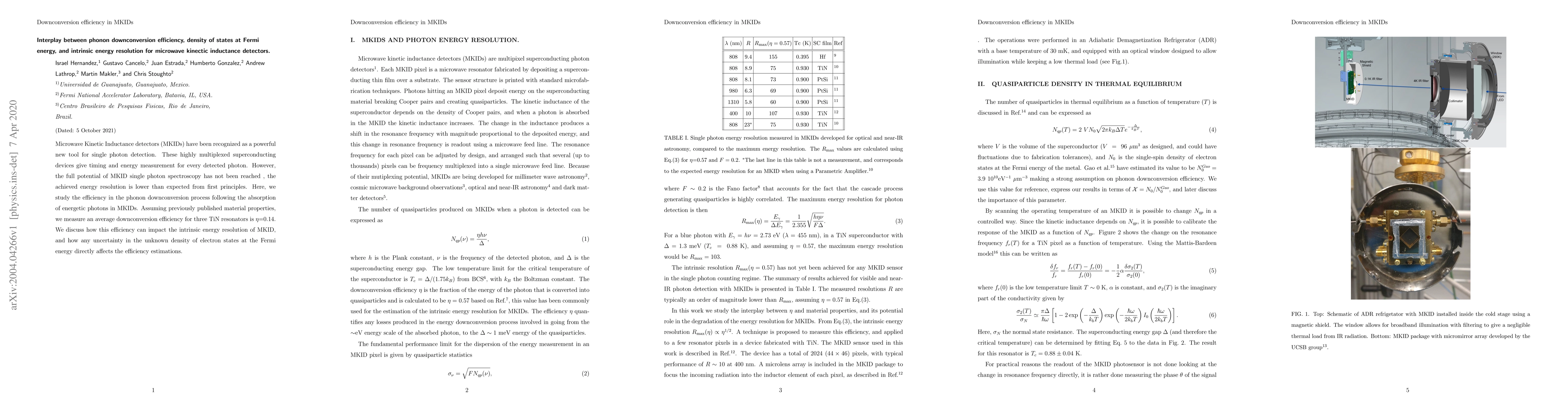 This paper investigates the phonon downconversion efficiency in Microwave Kinetic Inductance Detectors (MKIDs) and its impact on intrinsic energy resolution. It finds an average downconversion efficiency of $\eta$=0.14 for three TiN resonators and explores how uncertainties in the density of electron states at the Fermi energy affect these efficiency estimations.