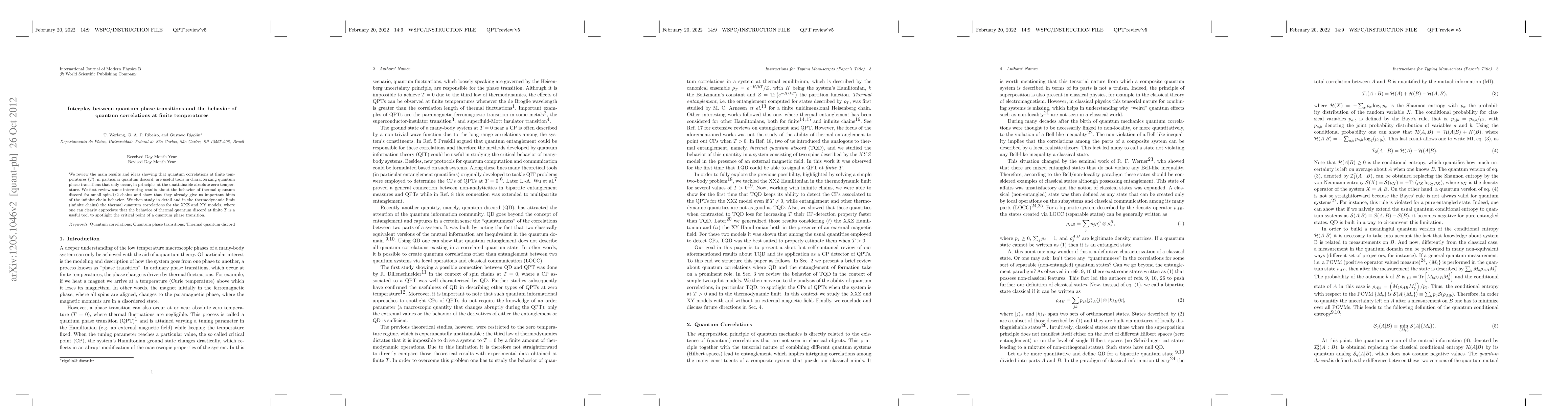 This paper reviews how quantum correlations, particularly quantum discord, at finite temperatures can characterize quantum phase transitions, traditionally occurring only at absolute zero. It highlights the behavior of thermal quantum discord in spin-1/2 chains and the XXZ and XY models, demonstrating its utility in identifying critical points of quantum phase transitions.