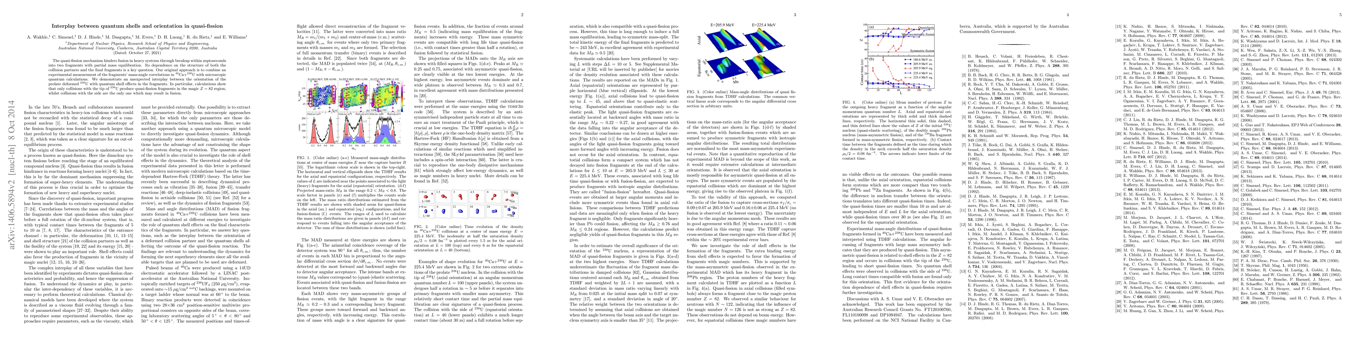 The quasi-fission mechanism hinders fusion in heavy systems through breakup within zeptoseconds into two fragments with partial mass equilibration. Its dependence on the structure of both the collision partners and the final fragments is a key question. Our original approach is to combine an experimental measurement of the fragments' mass-angle correlations in $^{40}$Ca$+^{238}$U with microscopic quantum calculations. We demonstrate an unexpected interplay between the orientation of the prolate deformed $^{238}$U with quantum shell effects in the fragments. In particular, calculations show that only collisions with the tip of $^{238}$U produce quasi-fission fragments in the magic $Z=82$ region, whilst collisions with the side are the only one which may result in fusion.