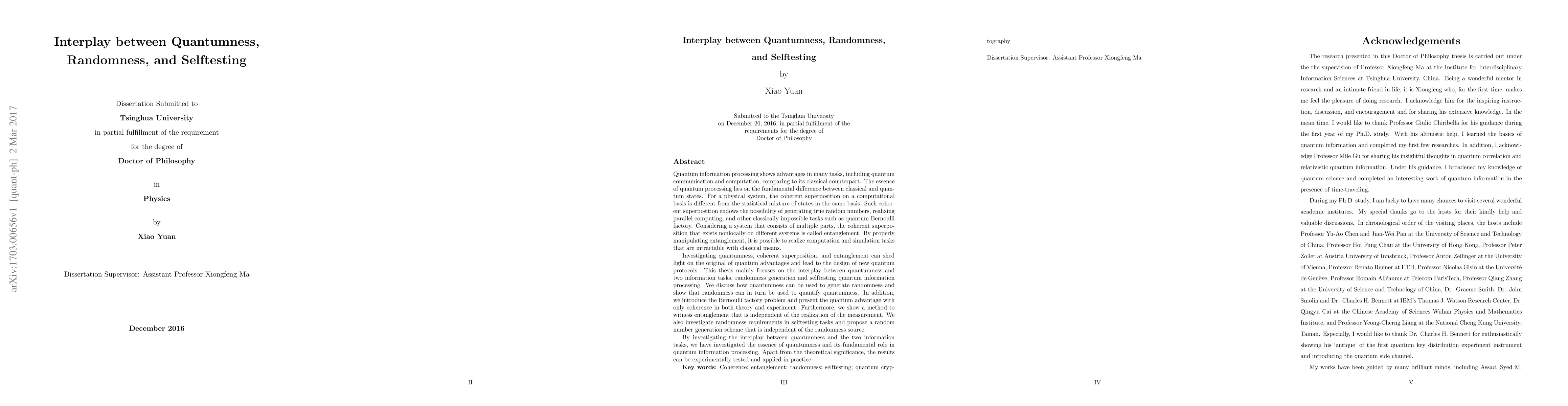 Quantum information processing shows advantages in many tasks, including quantum communication and computation, comparing to its classical counterpart. The essence of quantum processing lies on the fundamental difference between classical and quantum states. For a physical system, the coherent superposition on a computational basis is different from the statistical mixture of states in the same basis. Such coherent superposition endows the possibility of generating true random numbers, realizing parallel computing, and other classically impossible tasks such as quantum Bernoulli factory. Considering a system that consists of multiple parts, the coherent superposition that exists nonlocally on different systems is called entanglement. By properly manipulating entanglement, it is possible to realize computation and simulation tasks that are intractable with classical means. Investigating quantumness, coherent superposition, and entanglement can shed light on the original of quantum advantages and lead to the design of new quantum protocols. This thesis mainly focuses on the interplay between quantumness and two information tasks, randomness generation and selftesting quantum information processing. We discuss how quantumness can be used to generate randomness and show that randomness can in turn be used to quantify quantumness. In addition, we introduce the Bernoulli factory problem and present the quantum advantage with only coherence in both theory and experiment. Furthermore, we show a method to witness entanglement that is independent of the realization of the measurement. We also investigate randomness requirements in selftesting tasks and propose a random number generation scheme that is independent of the randomness source.