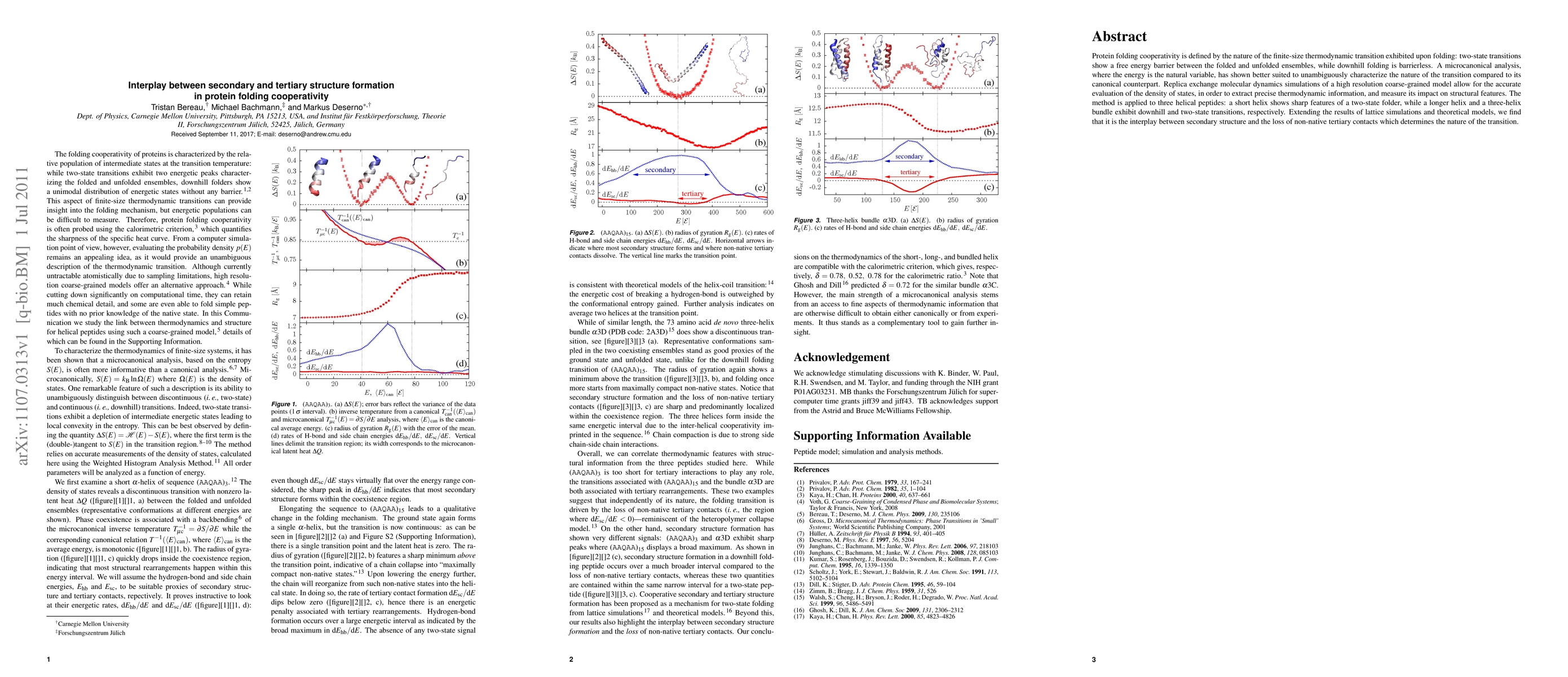 Protein folding cooperativity is defined by the nature of the finite-size thermodynamic transition exhibited upon folding: two-state transitions show a free energy barrier between the folded and unfolded ensembles, while downhill folding is barrierless. A microcanonical analysis, where the energy is the natural variable, has shown better suited to unambiguously characterize the nature of the transition compared to its canonical counterpart. Replica exchange molecular dynamics simulations of a high resolution coarse-grained model allow for the accurate evaluation of the density of states, in order to extract precise thermodynamic information, and measure its impact on structural features. The method is applied to three helical peptides: a short helix shows sharp features of a two-state folder, while a longer helix and a three-helix bundle exhibit downhill and two-state transitions, respectively. Extending the results of lattice simulations and theoretical models, we find that it is the interplay between secondary structure and the loss of non-native tertiary contacts which determines the nature of the transition.