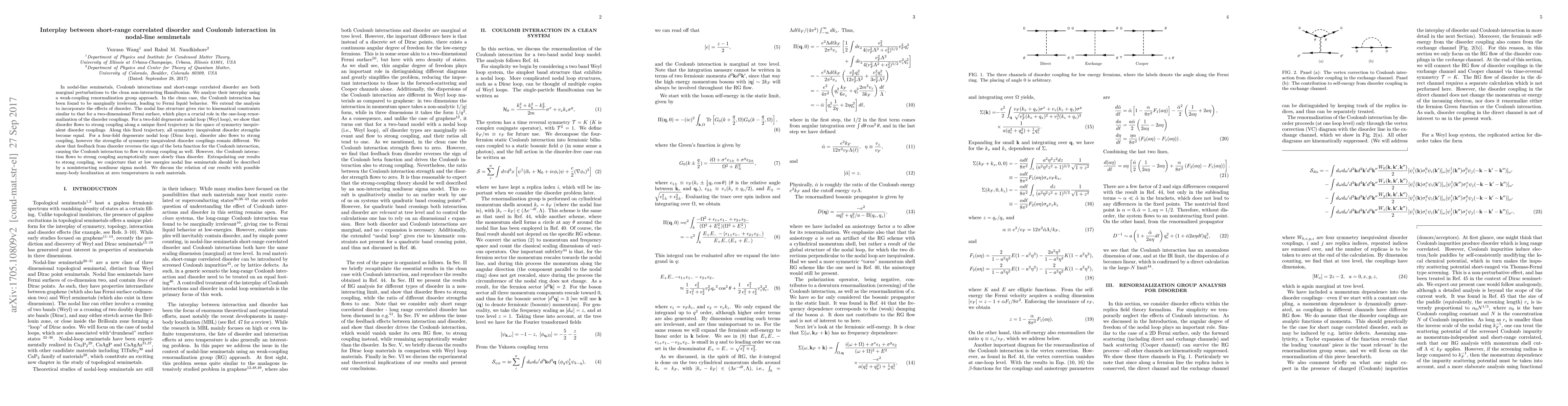 In nodal-line semimetals, Coulomb interactions and short-range correlated disorder are both marginal perturbations to the clean non-interacting Hamiltonian. We analyze their interplay using a weak-coupling renormalization group approach. In the clean case, the Coulomb interaction has been found to be marginally irrelevant, leading to Fermi liquid behavior. We extend the analysis to incorporate the effects of disorder. The nodal line structure gives rise to kinematical constraints similar to that for a two-dimensional Fermi surface, which plays a crucial role in the one-loop renor- malization of the disorder couplings. For a two-fold degenerate nodal loop (Weyl loop), we show that disorder flows to strong coupling along a unique fixed trajectory in the space of symmetry inequiv- alent disorder couplings. Along this fixed trajectory, all symmetry inequivalent disorder strengths become equal. For a four-fold degenerate nodal loop (Dirac loop), disorder also flows to strong coupling, however the strengths of symmetry inequivalent disorder couplings remain different. We show that feedback from disorder reverses the sign of the beta function for the Coulomb interaction, causing the Coulomb interaction to flow to strong coupling as well. However, the Coulomb interac- tion flows to strong coupling asymptotically more slowly than disorder. Extrapolating our results to strong coupling, we conjecture that at low energies nodal line semimetals should be described by a noninteracting nonlinear sigma model. We discuss the relation of our results with possible many-body localization at zero temperatures in such materials.