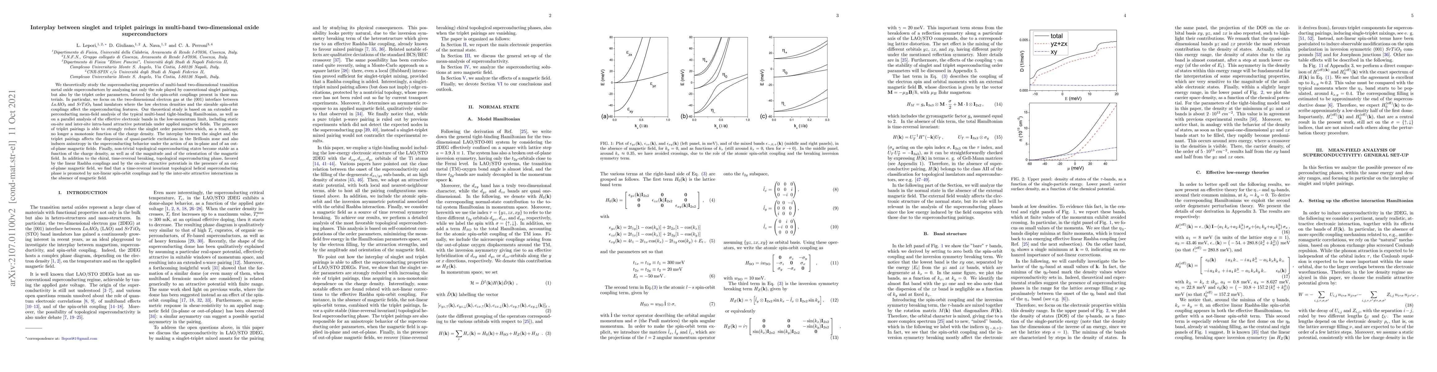 We theoretically study the superconducting properties of multi-band two-dimensional transition metal oxide superconductors by analyzing not only the role played by conventional singlet pairings, but also by the triplet order parameters, favored by the spin-orbit couplings present in these ma- terials. In particular, we focus on the two-dimensional electron gas at the (001) interface between LaAlO3 and SrTiO3 band insulators where the low electron densities and the sizeable spin-orbit couplings affect the superconducting features. Our theoretical study is based on an extended su- perconducting mean-field analysis of the typical multi-band tight-binding Hamiltonian, as well as on a parallel analysis of the effective electronic bands in the low-momentum limit, including static on-site and inter-site intra-band attractive potentials under applied magnetic fields. The presence of triplet pairings is able to strongly reduce the singlet order parameters which, as a result, are no longer a monotonic function of the charge density. The interplay between the singlet and the triplet pairings affects the dispersion of quasi-particle excitations in the Brillouin zone and also induces anisotropy in the superconducting behavior under the action of an in-plane and of an out- of-plane magnetic fields. Finally, non-trivial topological superconducting states become stable as a function of the charge density, as well as of the magnitude and of the orientation of the magnetic field. In addition to the chiral, time-reversal breaking, topological superconducting phase, favored by the linear Rashba couplings and by the on-site attractive potentials in the presence of an out- of-plane magnetic field, we find that a time-reversal invariant topological helical superconducting phase is promoted by not-linear spin-orbit couplings and by the inter-site attractive interactions in the absence of magnetic field.