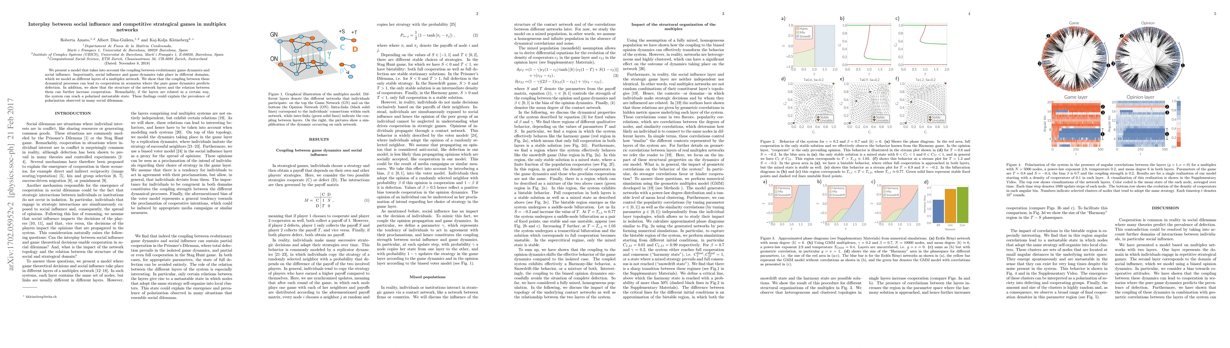 This paper models the interplay between social influence and competitive game dynamics in a multiplex network, demonstrating that coupling these processes can lead to cooperation where game dynamics alone predict defection. The study highlights how network layer structure and inter-layer relations can further enhance cooperation, potentially explaining social polarization in dilemmas.