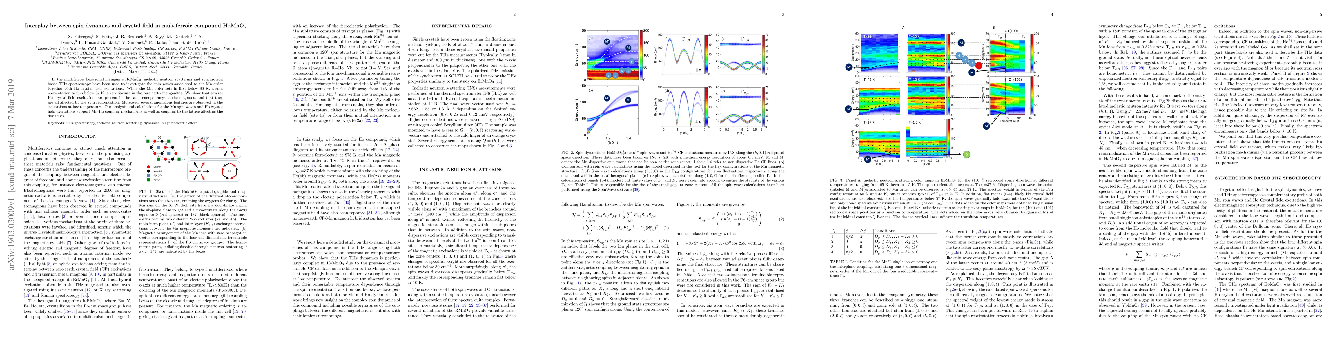 In the multiferroic hexagonal manganite HoMnO3, inelastic neutron scattering and synchrotron based THz spectroscopy have been used to investigate the spin waves associated to the Mn order together with Ho crystal field excitations. While the Mn order sets in first below 80 K, a spin reorientation occurs below 37 K, a rare feature in the rare earth manganites. We show that severalHo crystal field excitations are present in the same energy range as the magnons, and that they are all affected by the spin reorientation. Moreover, several anomalous features are observed in the excitations at low temperature. Our analysis and calculations for the Mn spin waves and Ho crystal field excitations support Mn-Ho coupling mechanisms as well as coupling to the lattice affecting the dynamics.