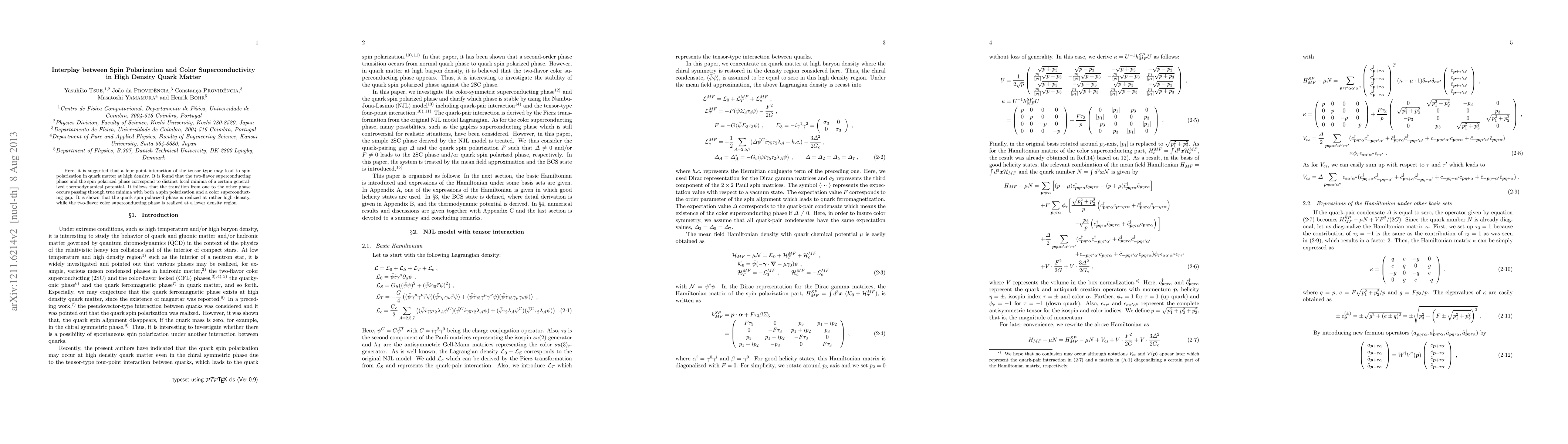 This paper explores the interplay between spin polarization and color superconductivity in high-density quark matter, suggesting that a tensor-type four-point interaction can induce spin polarization. It finds that the two-flavor superconducting phase and the spin polarized phase are distinct local minima, with transitions between them occurring through minima with both spin polarization and a color superconducting gap.