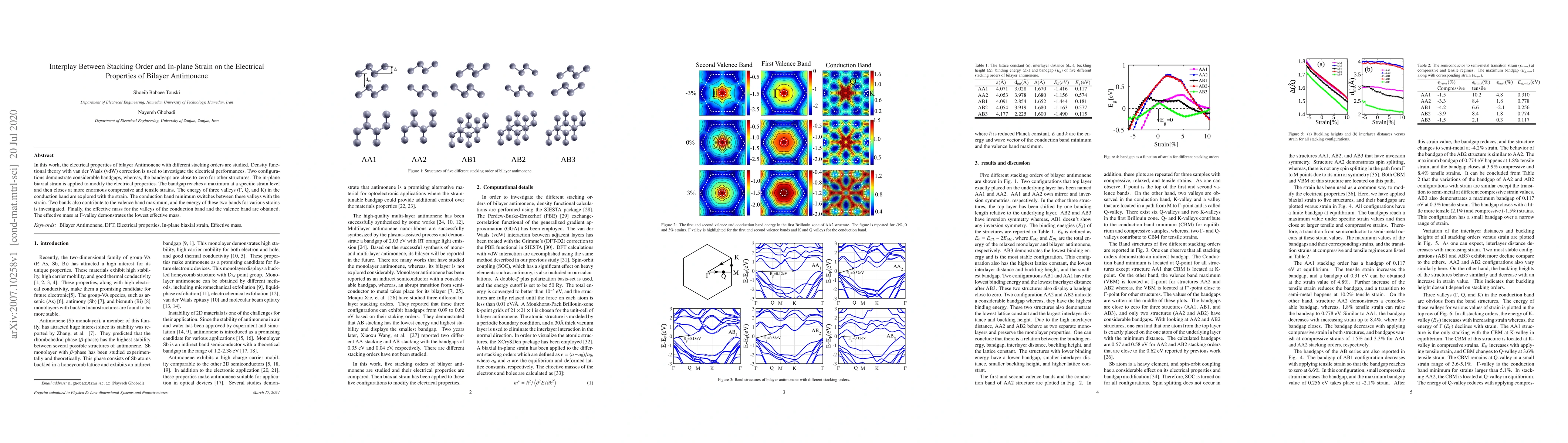 In this work, the electrical properties of bilayer Antimonene with different stacking orders are studied. Density functional theory with van der Waals (vdW) correction is used to investigate the electrical performances. Two configurations demonstrate considerable bandgaps, whereas, the bandgaps are close to zero for other structures. The in-plane biaxial strain is applied to modify the electrical properties. The bandgap reaches a maximum at a specific strain level and then closes at more enormous compressive and tensile strains. The energy of three valleys ($\Gamma$, Q, and K) in the conduction band are explored with the strain. The conduction band minimum switches between these valleys with the strain. Two bands also contribute to the valence band maximum, and the energy of these two bands for various strains is investigated. Finally, the effective mass for the valleys of the conduction band and the valence band are obtained. The effective mass at $\Gamma$-valley demonstrates the lowest effective mass.