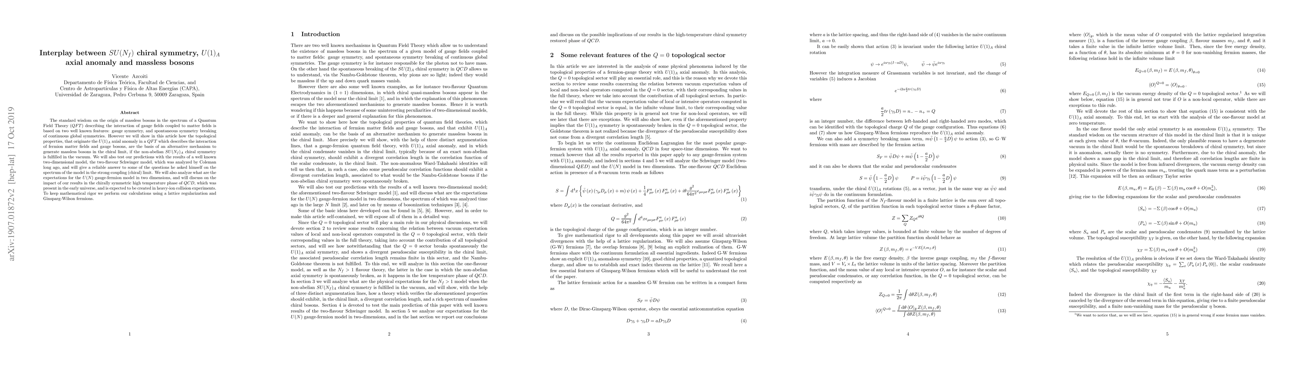 The standard wisdom on the origin of massless bosons in the spectrum of a Quantum Field Theory $(QFT)$ describing the interaction of gauge fields coupled to matter fields is based on two well known features: gauge symmetry, and spontaneous symmetry breaking of continuous global symmetries. However we will show in this article how the topological properties, that originate the $U(1)_A$ axial anomaly in a $QFT$ which describes the interaction of fermion matter fields and gauge bosons, are the basis of an alternative mechanism to generate massless bosons in the chiral limit, if the non-abelian $SU(N_f)_A$ chiral symmetry is fulfilled in the vacuum. We will also test our predictions with the results of a well known two-dimensional model, the two-flavour Schwinger model, which was analyzed by Coleman long ago, and will give a reliable answer to some of the questions he asked himself on the spectrum of the model in the strong-coupling (chiral) limit. We will also analyze what are the expectations for the $U(N)$ gauge-fermion model in two dimensions, and will discuss on the impact of our results in the chirally symmetric high temperature phase of $QCD$, which was present in the early universe, and is expected to be created in heavy-ion collision experiments.
