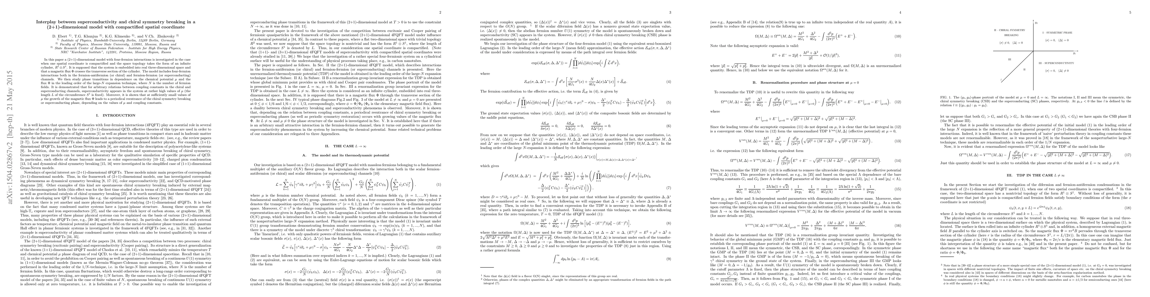 This paper investigates a (2+1)-dimensional model with four-fermion interactions in a compactified spatial coordinate, revealing that superconductivity emerges at high chemical potentials, while small chemical potentials and magnetic flux induce periodic reentrance between chiral symmetry breaking and superconducting phases.