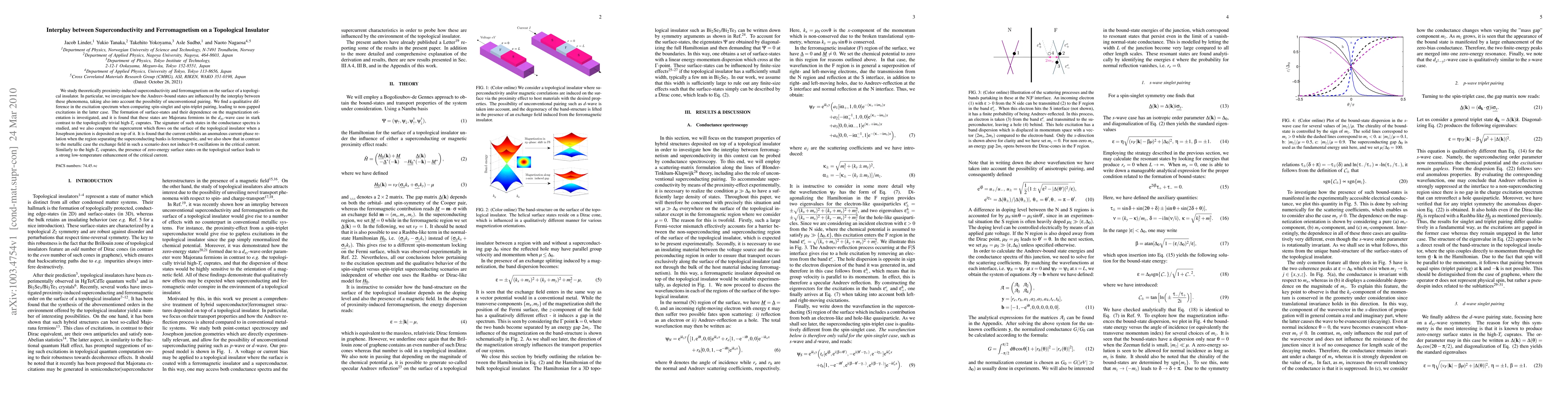 This paper theoretically explores the interaction between proximity-induced superconductivity and ferromagnetism on a topological insulator's surface, revealing distinct excitation spectra for spin-singlet and spin-triplet pairing, with the latter showing non-gapped excitations. It also investigates the formation of Majorana fermion states and their conductance signatures, finding an anomalous current-phase relation in the presence of a ferromagnetic region.