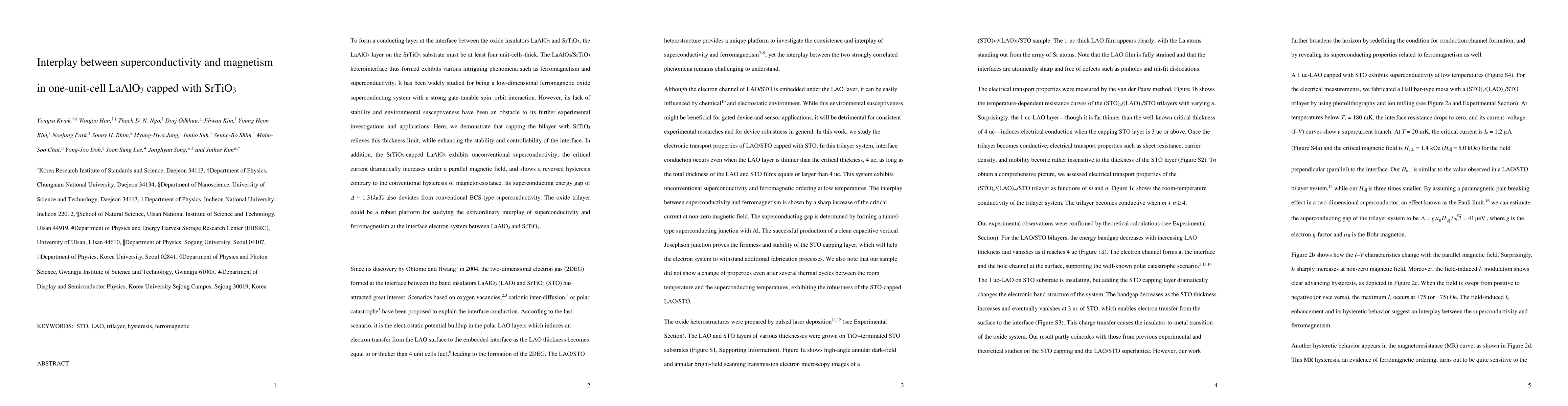This study demonstrates that capping a one-unit-cell thick LaAlO3 layer with SrTiO3 can enhance stability and controllability, leading to unconventional superconductivity with an unusual energy gap and reversed hysteresis behavior under magnetic fields. This oxide trilayer offers a promising platform for exploring the complex interaction between superconductivity and ferromagnetism.