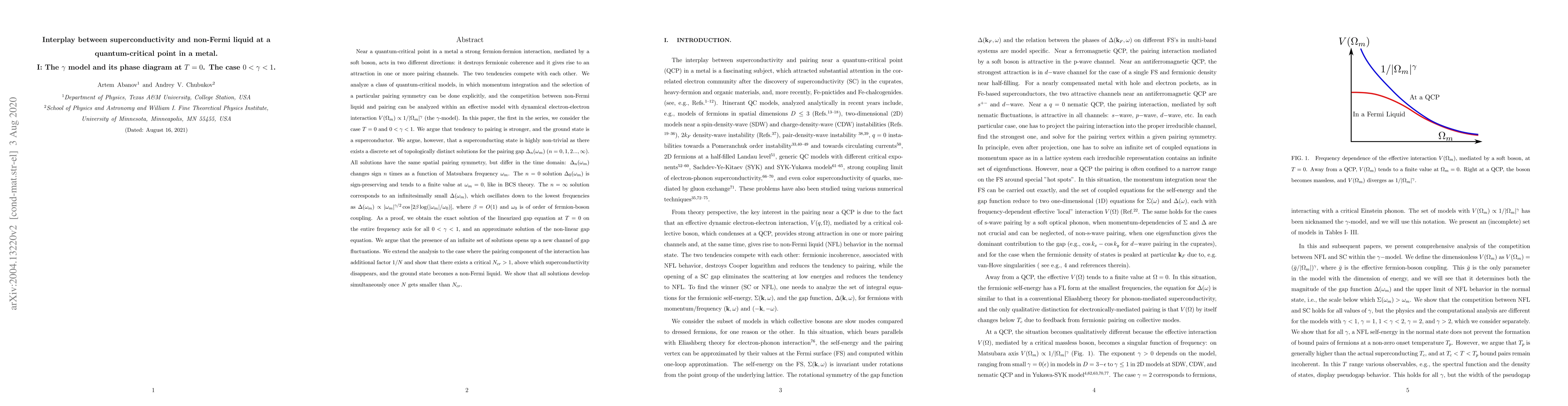 We analyze a class of quantum-critical models, in which momentum integration and the selection of a particular pairing symmetry can be done explicitly, and the competition between non-Fermi liquid and pairing can be analyzed within an effective model with dynamical electron-electron interaction $V(\Omega_m)\sim 1/|\Omega_m|^\gamma$ (the $\gamma$-model). In this paper, the first in the series, we consider the case $T=0$ and $0<\gamma <1$. We argue that tendency to pairing is stronger, and the ground state is a superconductor. We argue, however, that superconducting state is highly non-trivial as there exists a discrete set of topologically distinct solutions for the pairing gap $\Delta_n (\omega_m)$ ($n = 0, 1, 2..., \infty$). All solutions have the same spatial pairing symmetry, but differ in the time domain: $\Delta_n (\omega_m)$ changes sign $n$ times as a function of Matsubara frequency $\omega_m$. The $n =0$ solution $\Delta_0 (\omega_m)$ is sign-preserving and tends to a finite value at $\omega_m =0$, like in BCS theory. The $n = \infty$ solution corresponds to an infinitesimally small $\Delta (\omega_m)$. As a proof, we obtain the exact solution of the linearized gap equation at $T=0$ on the entire frequency axis for all $0<\gamma <1$, and an approximate solution of the non-linear gap equation.We argue that the presence of an infinite set of solutions opens up a new channel of gap fluctuations. We extend the analysis to the case where the pairing component of the interaction has additional factor $1/N$ and show that there exists a critical $N_{cr} >1$, above which superconductivity disappears, and the ground state becomes a non-Fermi liquid.We show that all solutions develop simultaneously once $N$ gets smaller than $N_{cr}$.