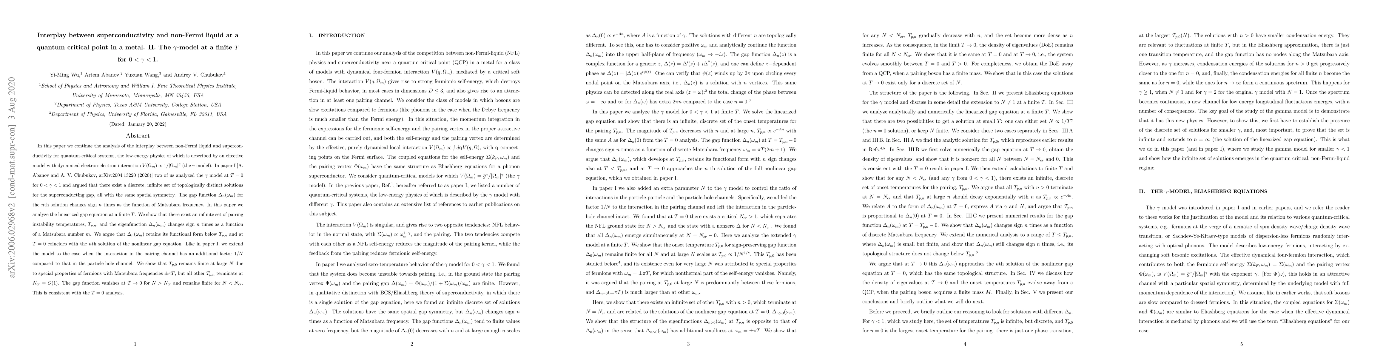 In this paper we continue the analysis of the interplay between non-Fermi liquid and superconductivity for quantum-critical systems, the low-energy physics of which is described by an effective model with dynamical electron-electron interaction $V(\Omega_m) \propto 1/|\Omega_m|^\gamma$ (the $\gamma$ model). In paper I [A. Abanov and A. V. Chubukov, Phys Rev B. 102, 024524 (2020)] two of us analyzed the $\gamma$ model at $T=0$ for $0<\gamma <1$ and argued that there exist a discrete, infinite set of topologically distinct solutions for the superconducting gap, all with the same spatial symmetry. The gap function $\Delta_n (\omega_m)$ for the $n$th solution changes sign $n$ times as the function of Matsubara frequency. In this paper we analyze the linearized gap equation at a finite $T$. We show that there exist an infinite set of pairing instability temperatures, $T_{p,n}$, and the eigenfunction $\Delta_n (\omega_{m})$ changes sign $n$ times as a function of a Matsubara number $m$. We argue that $\Delta_n (\omega_{m})$ retains its functional form below $T_{p,n}$ and at $T=0$ coincides with the $n$th solution of the nonlinear gap equation. Like in paper I, we extend the model to the case when the interaction in the pairing channel has an additional factor $1/N$ compared to that in the particle-hole channel. We show that $T_{p,0}$ remains finite at large $N$ due to special properties of fermions with Matsubara frequencies $\pm \pi T$, but all other $T_{p,n}$ terminate at $N_{cr} = O(1)$. The gap function vanishes at $T \to 0$ for $N > N_{cr}$ and remains finite for $N < N_{cr}$. This is consistent with the $T =0$ analysis.