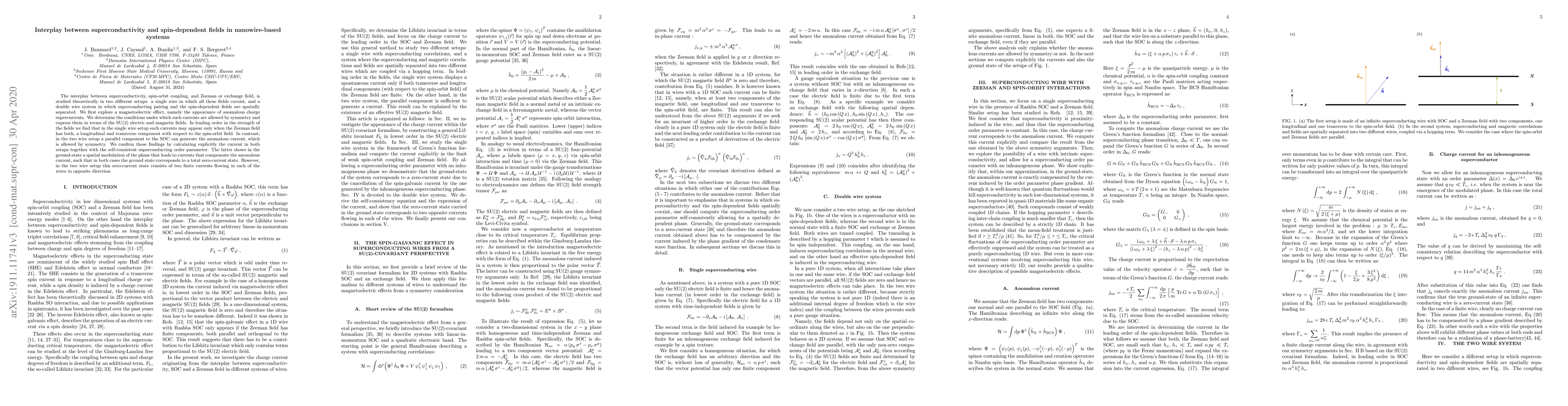 The interplay between superconductivity, spin-orbit coupling, and Zeeman or exchange field, is studied theoretically in two different setups: a single wire in which all these fields coexist, and a double wire system in which superconducting pairing and the spin-dependent fields are spatially separated. We first explore a magnetoelectric effect, namely the appearance of anomalous charge supercurrents. We determine the conditions under which such currents are allowed by symmetry and express them in terms of the SU(2) electric and magnetic fields. In leading order in the strength of the fields we find that in the single wire setup such currents may appear only when the Zeeman field has both, a longitudinal and transverse component with respect to the spin-orbit field. In contrast, in the two wire setup a parallel component to the SOC can generate the anomalous current, which is allowed by symmetry. We confirm these findings by calculating explicitly the current in both setups together with the self-consistent superconducting order parameter. The latter shows in the ground-state a spatial modulation of the phase that leads to currents that compensate the anomalous current, such that in both cases the ground state corresponds to a total zero-current state. However, in the two wire setup this zero-current state consists of two finite currents flowing in each of the wires in opposite direction.