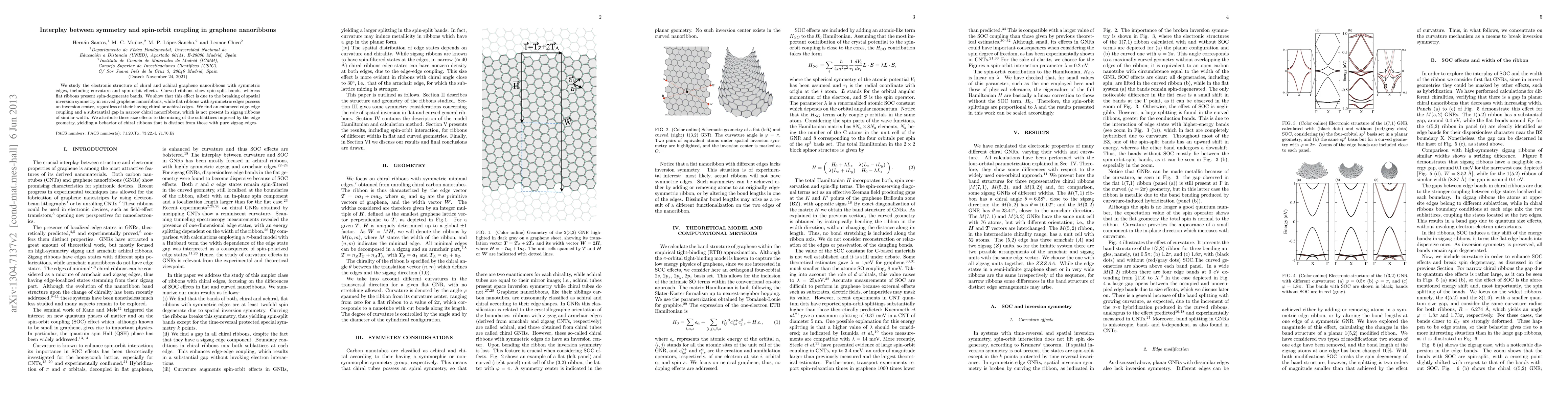This study investigates how symmetry and spin-orbit coupling influence the electronic structure of graphene nanoribbons, revealing that curved ribbons exhibit spin-split bands due to broken spatial inversion symmetry, while flat ribbons maintain spin-degenerate bands. Narrow chiral nanoribbons show enhanced edge-edge coupling and a substantial gap, contrasting with zigzag ribbons of similar width, attributed to sublattice mixing from edge geometry.