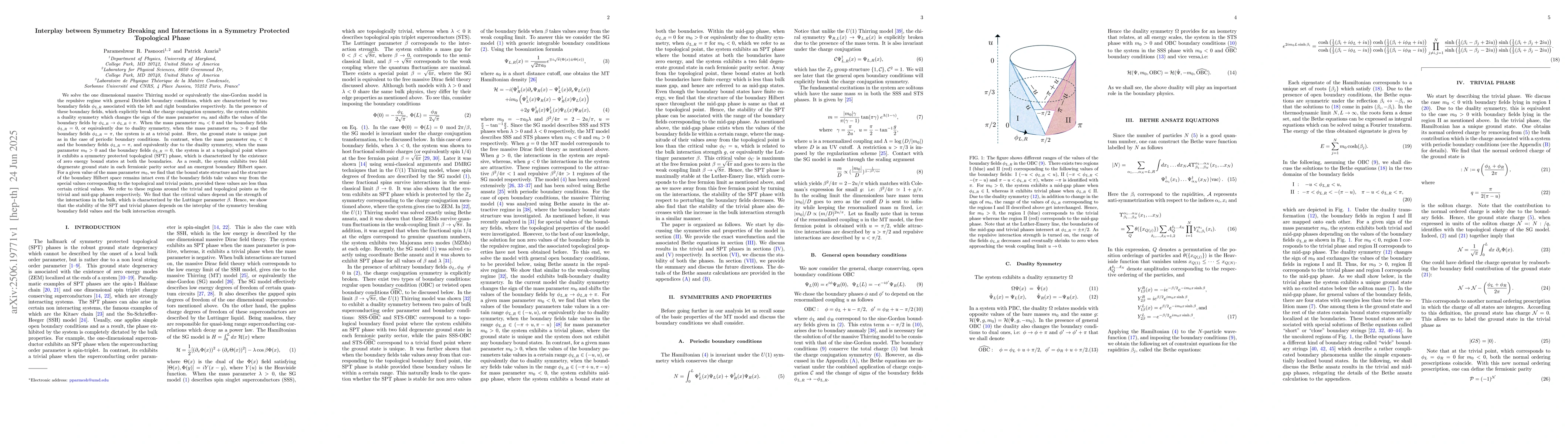 We solve the one dimensional massive Thirring model or equivalently the sine-Gordon model in the repulsive regime with general Dirichlet boundary conditions, which are characterized by two boundary fields $\phi_{L,R}$ associated with the left and right boundaries respectively. In the presence of these boundary fields, which explicitly break the charge conjugation symmetry, the system exhibits a duality symmetry which changes the sign of the mass parameter $m_0$ and shifts the values of the boundary fields by $\phi_{L,R}\rightarrow \phi_{L,R}+\pi$. When the mass parameter $m_0<0$ and the boundary fields $\phi_{L,R}=0$, or equivalently due to duality symmetry, when the mass parameter $m_0>0$ and the boundary fields $\phi_{L,R}=\pi$, the system is at a trivial point. Here, the ground state is unique just as in the case of periodic boundary conditions. In contrast, when the mass parameter $m_0<0$ and the boundary fields $\phi_{L,R}=\pi$, and equivalently due to the duality symmetry, when the mass parameter $m_0>0$ and the boundary fields $\phi_{L,R}=0$, the system is at a topological point where it exhibits a symmetry protected topological (SPT) phase, which is characterized by the existence of zero energy bound states at both the boundaries. For a given value of the mass parameter $m_0$, we find that these phases remain stable in the presence of symmetry breaking fields at the boundary, provided they are smaller than certain critical values which depend on the strength of the interactions in the bulk. Hence, we show that the stability of the SPT and trivial phases depends on the interplay of the symmetry breaking boundary field values and the bulk interaction strength.