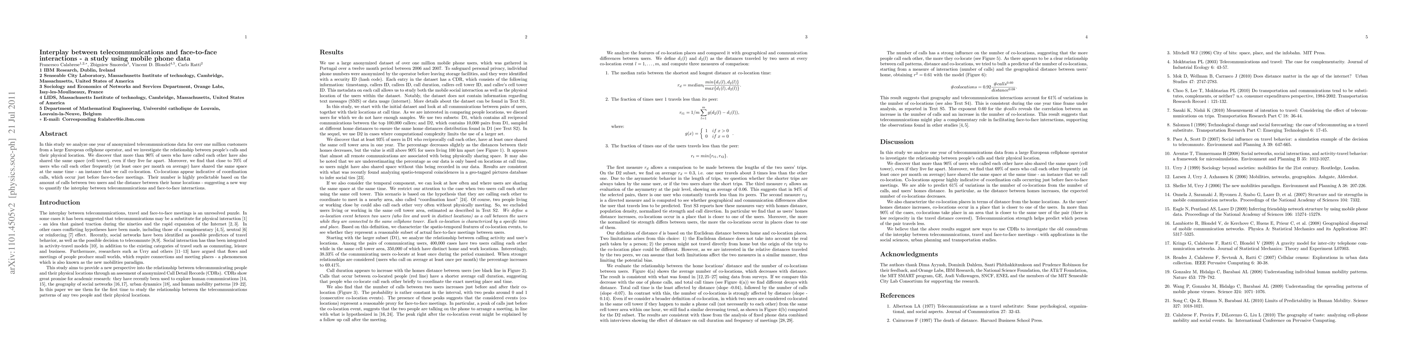 A study using mobile phone data found that over 90% of users who called each other had also shared the same space, indicating coordination calls before face-to-face meetings. Co-location was highly predictable based on call frequency and distance between locations.