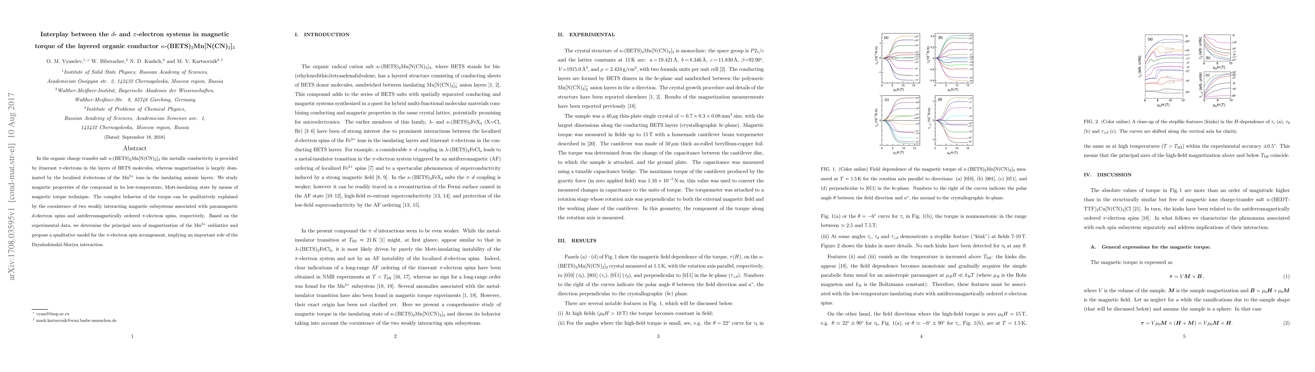 In the organic charge transfer salt k-(BETS)2Mn[N(CN)2]3 the metallic conductivity is provided by itinerant pi-electrons in the layers of BETS molecules, whereas magnetization is largely dominated by the localized d-electrons of the Mn2+ ions in the insulating anionic layers. We study magnetic properties of the compound in its low-temperature, Mott-insulating state by means of magnetic torque technique. The complex behavior of the torque can be qualitatively explained by the coexistence of two weakly interacting magnetic subsystems associated with paramagnetic d-electron spins and antiferromagnetically ordered pi-electron spins, respectively. Based on the experimental data, we determine the principal axes of magnetization of the Mn2+ sublattice and propose a qualitative model for the pi-electron spin arrangement, implying an important role of the Dzyaloshinskii-Moriya interaction.