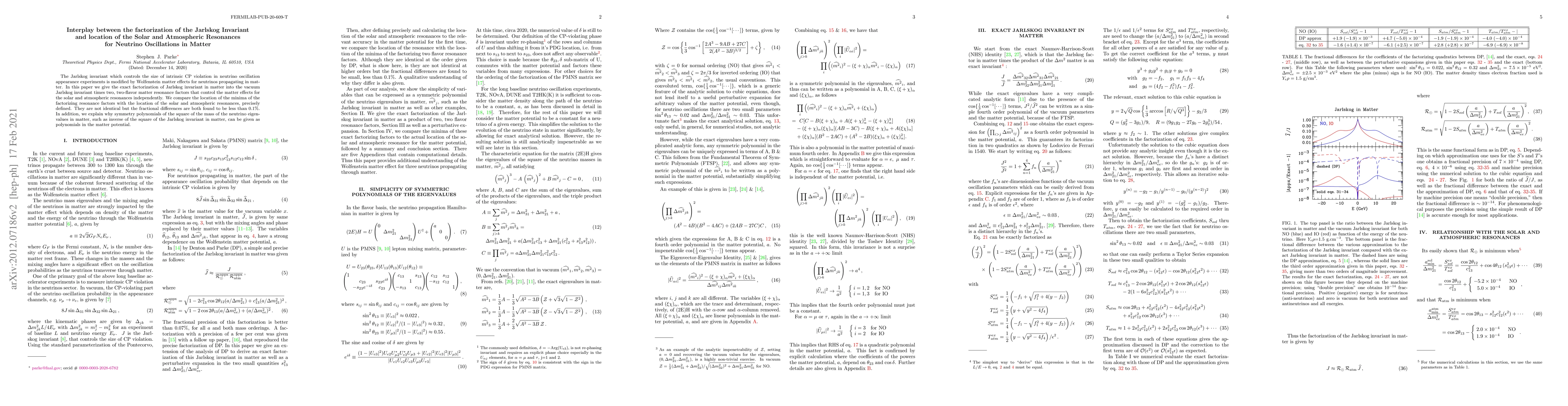 This paper presents an exact factorization of the modified Jarlskog invariant in neutrino oscillations in matter, revealing the vacuum Jarlskog invariant multiplied by two independent two-flavor resonance factors. It finds that the locations of the solar and atmospheric resonances differ by less than 0.1% from the minima of these factors, and explains how symmetry polynomials related to the mass eigenvalues in matter can be expressed as polynomials in the matter potential.