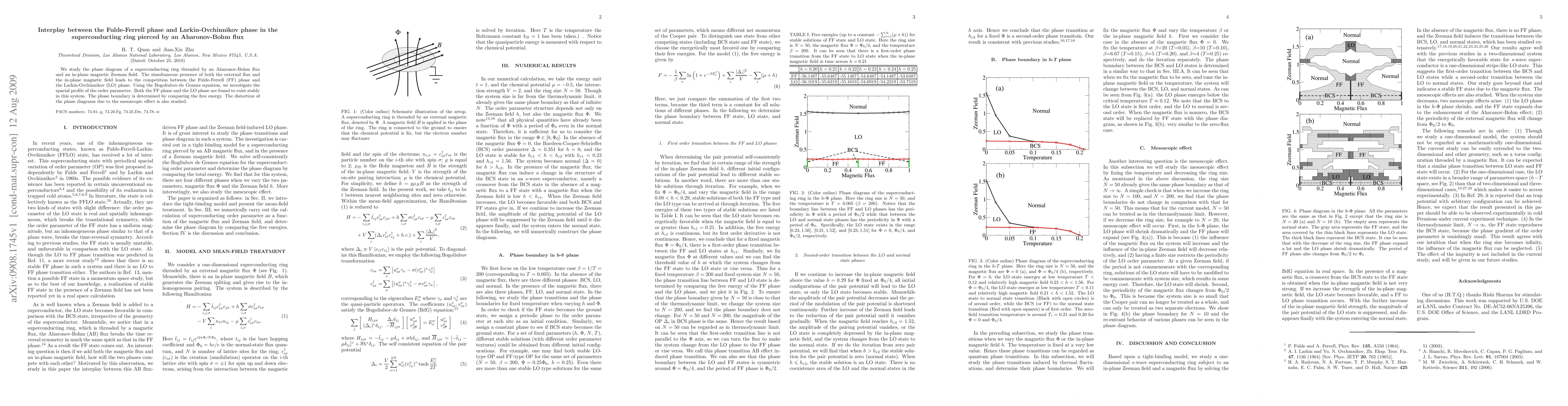 We study the phase diagram of a superconducting ring threaded by an Aharonov-Bohm flux and an in-plane magnetic Zeeman field. The simultaneous presence of both the external flux and the in-plane magnetic field leads to the competition between the Fulde-Ferrell (FF) phase and the Larkin-Ovchinnikov (LO) phase. Using the Bogoliubov-de Gennes equation, we investigate the spacial profile of the order parameter. Both the FF phase and the LO phase are found to exist stably in this system. The phase boundary is determined by comparing the free energy. The distortion of the phase diagrams due to the mesoscopic effect is also studied.