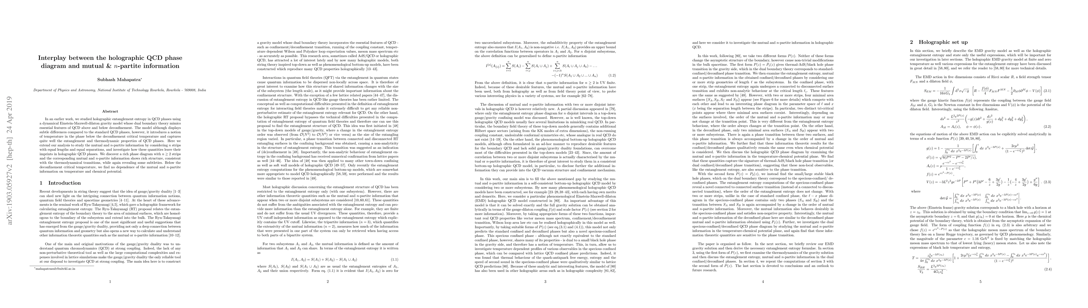 This paper explores the mutual and $n$-partite information in holographic QCD phases using a dynamical Einstein-Maxwell-dilaton gravity model. It finds a complex phase diagram with rich structure in mutual and $n$-partite information, consistent with thermodynamic transitions, but reveals no temperature or chemical potential dependence below the deconfinement critical temperature.