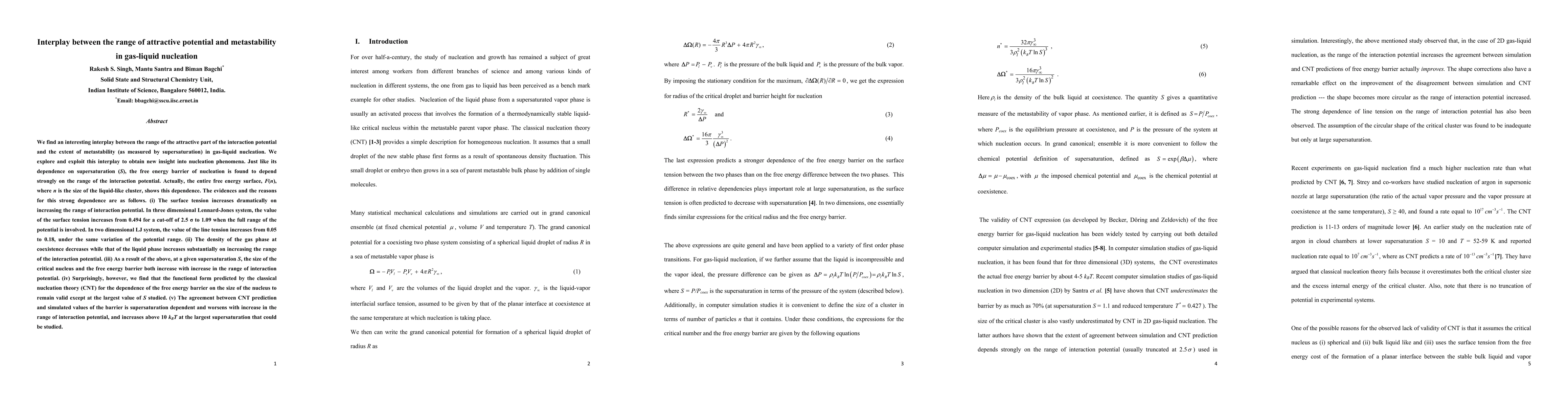 We find an interesting interplay between the range of the attractive part of the interaction potential and the extent of metastability (as measured by supersaturation) in gas-liquid nucleation. We explore and exploit this interplay to obtain new insight into nucleation phenomena. Just like its dependence on supersaturation (S), the free energy barrier of nucleation is found to depend strongly on the range of the interaction potential. Actually, the entire free energy surface, F(n), where n is the size of the liquid-like cluster, shows this dependence. The evidences and the reasons for this strong dependence are as follows. (i) The surface tension increases dramatically on increasing the range of interaction potential. In three dimensional Lennard-Jones system, the value of the surface tension increases from 0.494 for a cut-off of 2.5 {\sigma} to 1.09 when the full range of the potential is involved. In two dimensional LJ system, the value of the line tension increases from 0.05 to 0.18, under the same variation of the potential range. (ii) The density of the gas phase at coexistence decreases while that of the liquid phase increases substantially on increasing the range of the interaction potential. (iii) As a result of the above, at a given supersaturation S, the size of the critical nucleus and the free energy barrier both increase with increase in the range of interaction potential. (iv) Surprisingly, however, we find that the functional form predicted by the classical nucleation theory (CNT) for the dependence of the free energy barrier on the size of the nucleus to remain valid except at the largest value of S studied. (v) The agreement between CNT prediction and simulated values of the barrier is supersaturation dependent and worsens with increase in the range of interaction potential, and increases above 10 kBT at the largest supersaturation that could be studied.