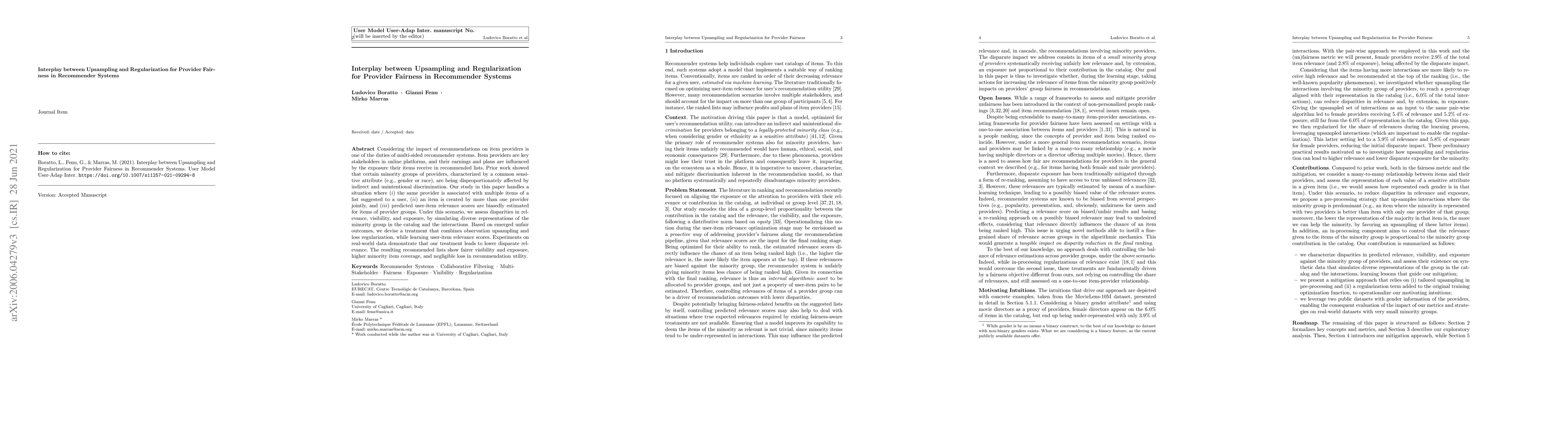 This paper investigates the interplay between upsampling and regularization to address provider fairness in recommender systems, where minority provider groups face disproportionate exposure and relevance biases. The proposed treatment combining these techniques leads to fairer visibility and exposure of minority items with minimal loss in recommendation utility.