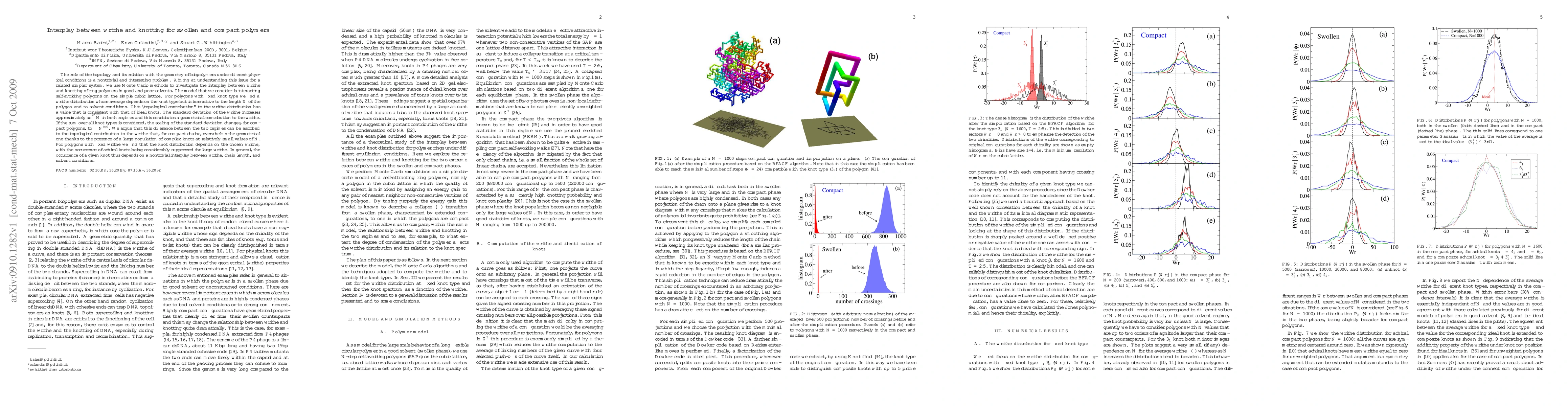 The role of the topology and its relation with the geometry of biopolymers under different physical conditions is a nontrivial and interesting problem. Aiming at understanding this issue for a related simpler system, we use Monte Carlo methods to investigate the interplay between writhe and knotting of ring polymers in good and poor solvents. The model that we consider is interacting self-avoiding polygons on the simple cubic lattice. For polygons with fixed knot type we find a writhe distribution whose average depends on the knot type but is insensitive to the length $N$ of the polygon and to solvent conditions. This "topological contribution" to the writhe distribution has a value that is consistent with that of ideal knots. The standard deviation of the writhe increases approximately as $\sqrt{N}$ in both regimes and this constitutes a geometrical contribution to the writhe. If the sum over all knot types is considered, the scaling of the standard deviation changes, for compact polygons, to $\sim N^{0.6}$. We argue that this difference between the two regimes can be ascribed to the topological contribution to the writhe that, for compact chains, overwhelms the geometrical one thanks to the presence of a large population of complex knots at relatively small values of $N$. For polygons with fixed writhe we find that the knot distribution depends on the chosen writhe, with the occurrence of achiral knots being considerably suppressed for large writhe. In general, the occurrence of a given knot thus depends on a nontrivial interplay between writhe, chain length, and solvent conditions.