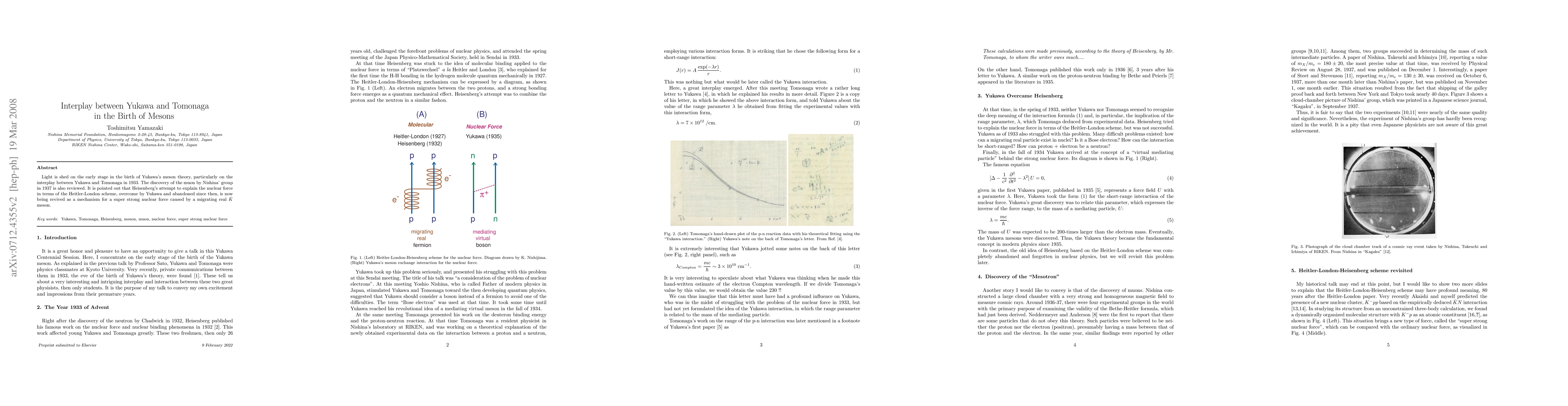 Light is shed on the early stage in the birth of Yukawa's meson theory, particularly on the interplay between Yukawa and Tomonaga in 1933. The discovery of the muon by Nishina' group in 1937 is also reviewed. It is pointed out that Heisenberg's attempt to explain the nuclear force in terms of the Heitler-London scheme, overcome by Yukawa and abandoned since then, is now being revived as a mechanism for a super strong nuclear force caused by a migrating real Kbar meson.