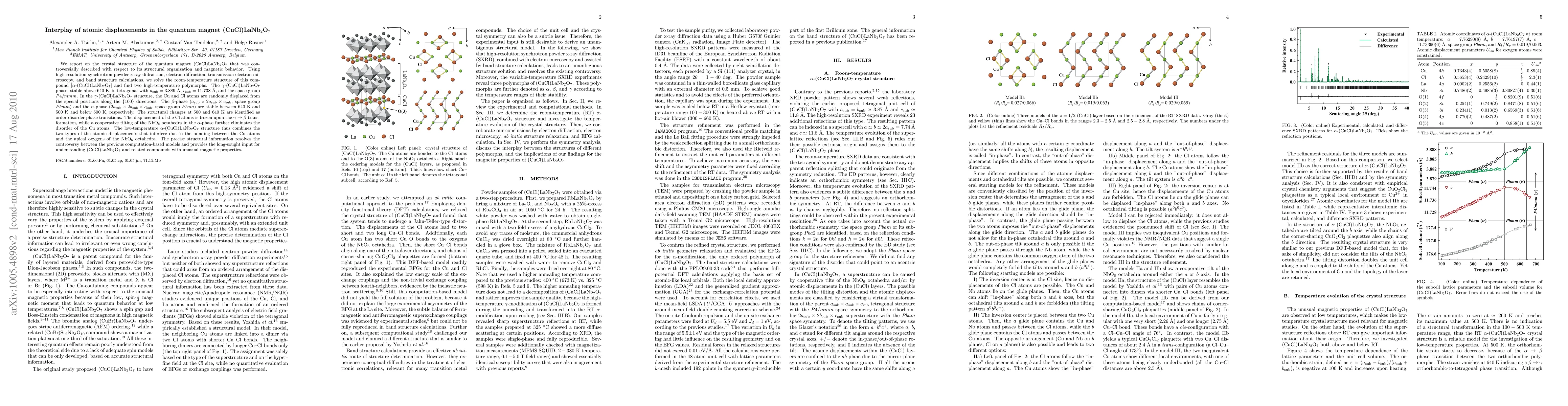 We report on the crystal structure of the quantum magnet (CuCl)LaNb2O7 that was controversially described with respect to its structural organization and magnetic behavior. Using high-resolution synchrotron powder x-ray diffraction, electron diffraction, transmission electron microscopy, and band structure calculations, we solve the room-temperature structure of this compound [alpha-(CuCl)LaNb2O7] and find two high-temperature polymorphs. The gamma-(CuCl)LaNb2O7 phase, stable above 640K, is tetragonal with a(sub) = 3.889 A, c(sub) = 11.738 A, and the space group P4/mmm. In the gamma-(CuCl)LaNb2O7 structure, the Cu and Cl atoms are randomly displaced from the special positions along the {100} directions. The beta-phase [a(sub) x 2a(sub) x c(sub), space group Pbmm] and the alpha-phase [2a(sub) x 2a(sub) x c(sub), space group Pbam] are stable between 640 K and 500 K and below 500 K, respectively. The structural changes at 500 K and 640 K are identified as order-disorder phase transitions. The displacement of the Cl atoms is frozen upon the gamma --> beta transformation, while a cooperative tilting of the NbO6 octahedra in the alpha-phase further eliminates the disorder of the Cu atoms. The low-temperature alpha-(CuCl)LaNb2O7 structure thus combines the two types of the atomic displacements that interfere due to the bonding between the Cu atoms and the apical oxygens of the NbO6 octahedra. The precise structural information resolves the controversy between the previous computation-based models and provides the long-sought input for understanding the magnetic properties of (CuCl)LaNb2O7.