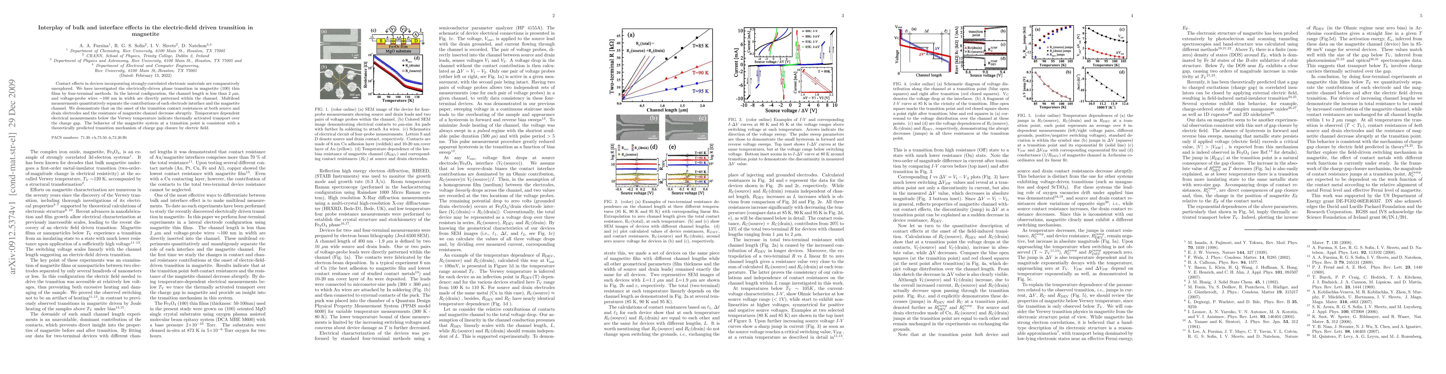 Contact effects in devices incorporating strongly-correlated electronic materials are comparatively unexplored. We have investigated the electrically-driven phase transition in magnetite (100) thin films by four-terminal methods. In the lateral configuration, the channel length is less than 2 $\mu$m, and voltage-probe wires $\sim$100 nm in width are directly patterned within the channel. Multilead measurements quantitatively separate the contributions of each electrode interface and the magnetite channel. We demonstrate that on the onset of the transition contact resistances at both source and drain electrodes and the resistance of magnetite channel decrease abruptly. Temperature dependent electrical measurements below the Verwey temperature indicate thermally activated transport over the charge gap. The behavior of the magnetite system at a transition point is consistent with a theoretically predicted transition mechanism of charge gap closure by electric field.