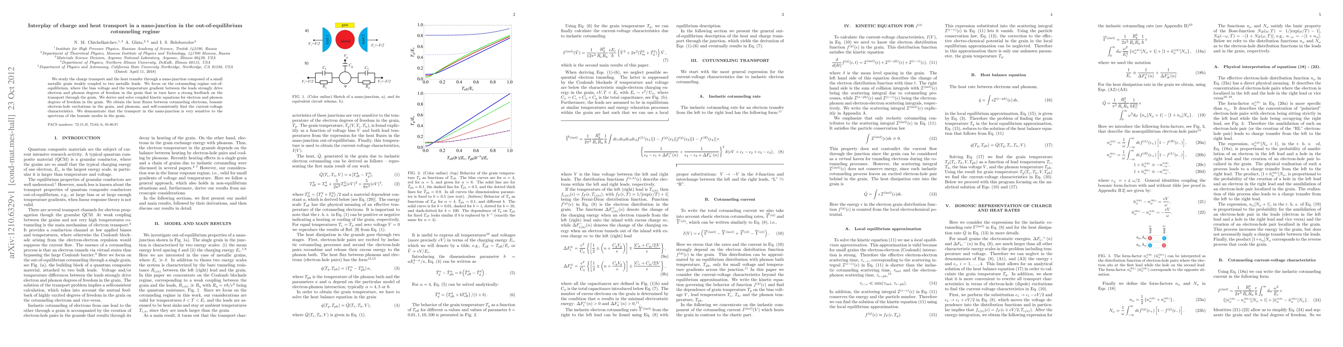 This paper investigates charge and heat transport in a nano-junction under out-of-equilibrium cotunneling conditions, deriving coupled kinetic equations for electron and phonon dynamics. It reveals significant sensitivity of transport characteristics to the grain's bosonic mode spectrum.