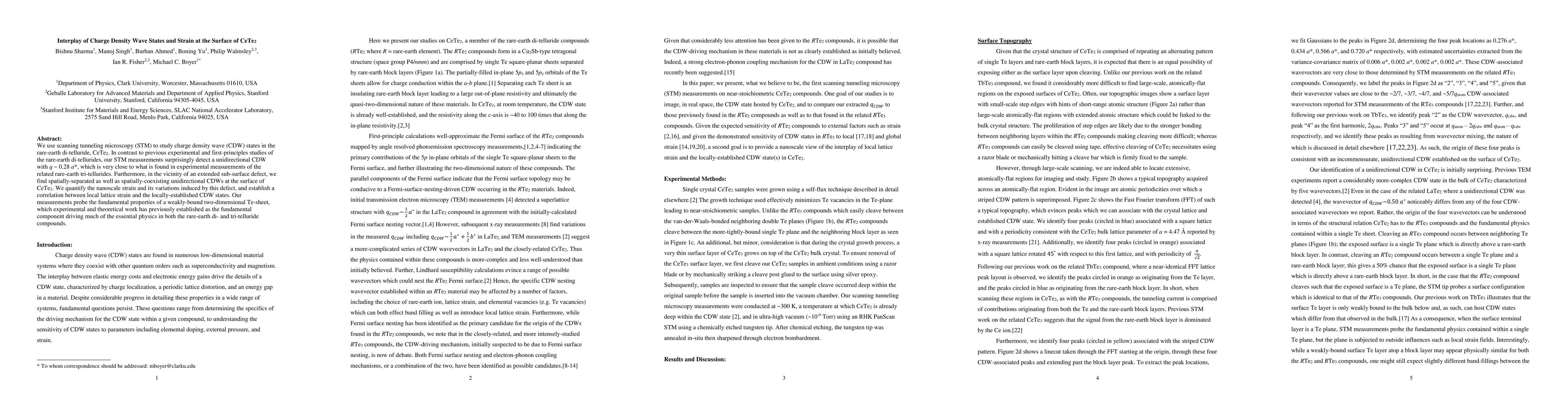 Researchers used scanning tunneling microscopy to study charge density wave states in CeTe$_2$, detecting a unidirectional CDW that varies near an extended sub-surface defect, revealing the correlation between strain and local CDW states.