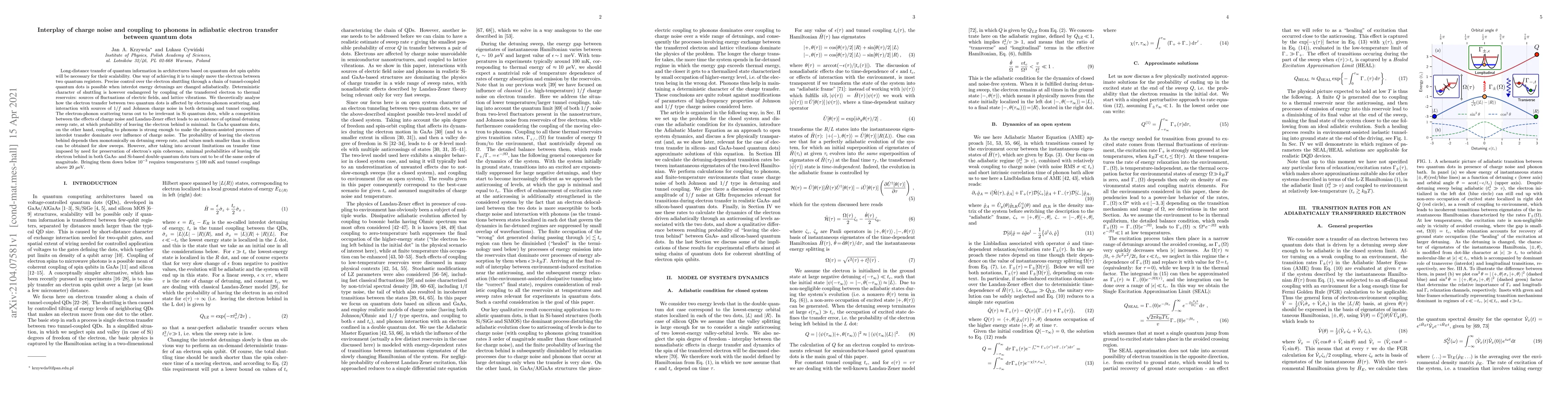 This paper investigates the impact of electron-phonon scattering and charge noise on adiabatic electron transfer between quantum dots. In Si quantum dots, charge noise dominates, while in GaAs quantum dots, phonon coupling significantly affects transfer, though both systems require ultra-low temperatures and strong tunnel couplings to achieve low error probabilities.