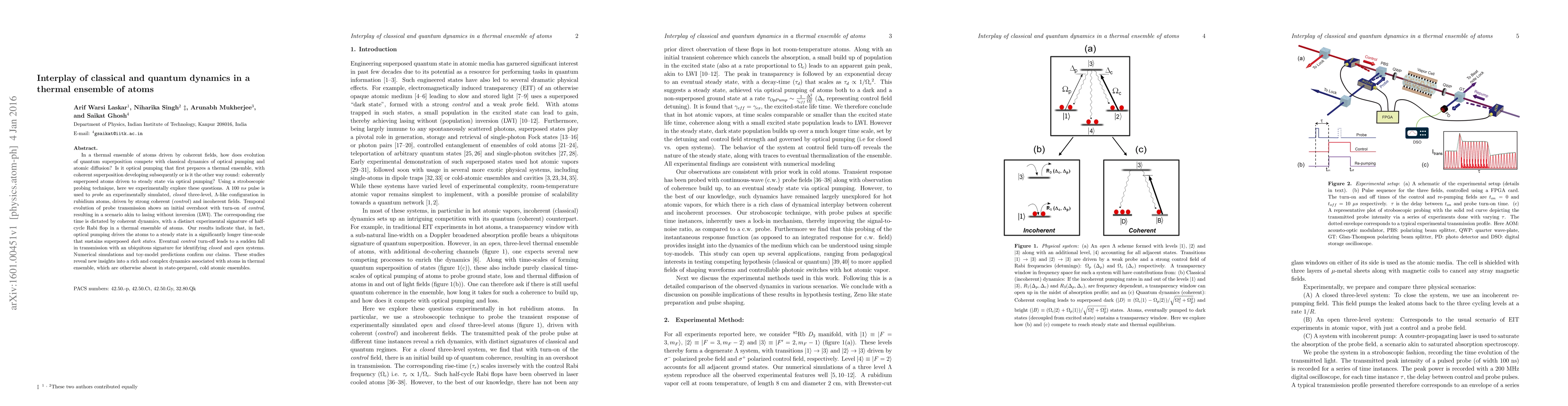 In a thermal ensemble of atoms driven by coherent fields, how does evolution of quantum superposition compete with classical dynamics of optical pumping and atomic diffusion? Is it optical pumping that first prepares a thermal ensemble, with coherent superposition developing subsequently or is it the other way round: coherently superposed atoms driven to steady state via optical pumping? Using a stroboscopic probing technique, here we experimentally explore these questions. A 100 ns pulse is used to probe an experimentally simulated, closed three-level, lambda-like configuration in rubidium atoms, driven by strong coherent control and incoherent fields. Temporal evolution of probe transmission shows an initial overshoot with turn-on of control, resulting in a scenario akin to lasing without inversion (LWI). The corresponding rise time is dictated by coherent dynamics, with a distinct experimental signature of half-cycle Rabi flop in a thermal ensemble of atoms. Our results indicate that, in fact, optical pumping drives the atoms to a steady state in a significantly longer time-scale that sustains superposed dark states. Eventual control turn-off leads to a sudden fall in transmission with an ubiquitous signature for identifying closed and open systems. Numerical simulations and toy-model predictions confirm our claims. These studies reveal new insights into a rich and complex dynamics associated with atoms in thermal ensemble, which are otherwise absent in state-prepared, cold atomic ensembles.