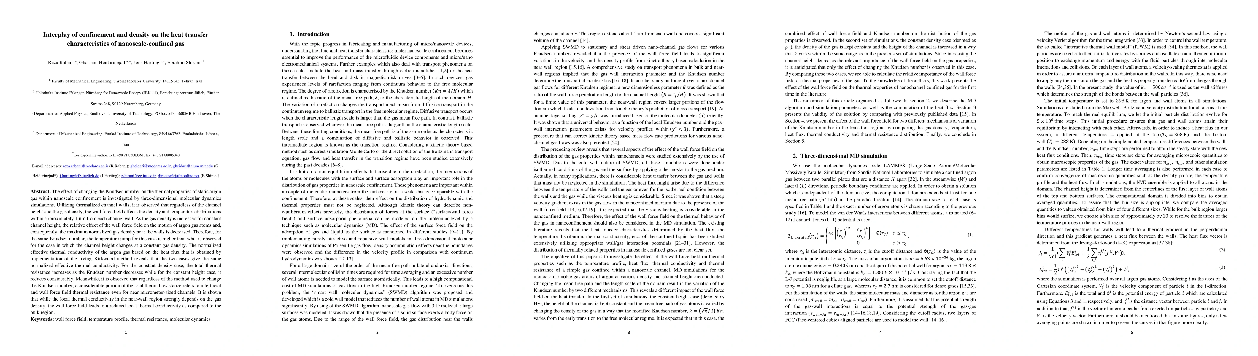 The effect of changing the Knudsen number on the thermal properties of static argon gas within nanoscale confinement is investigated by three-dimensional molecular dynamics simulations. Utilizing thermalized channel walls, it is observed that regardless of the channel height and the gas density, the wall force field affects the density and temperature distributions within approximately 1 nm from each channel wall. As the gas density is increased for constant channel height, the relative effect of the wall force field on the motion of argon gas atoms and, consequently, the maximum normalized gas density near the walls is decreased. Therefore, for the same Knudsen number, the temperature jump for this case is higher than what is observed for the case in which the channel height changes at a constant gas density. The normalized effective thermal conductivity of the argon gas based on the heat flux that is obtained by implementation of the Irving-Kirkwood method reveals that the two cases give the same normalized effective thermal conductivity. For the constant density case, the total thermal resistance increases as the Knudsen number decreases while for the constant height case, it reduces considerably. Meanwhile, it is observed that regardless of the method used to change the Knudsen number, a considerable portion of the total thermal resistance refers to interfacial and wall force field thermal resistance even for near micrometer sized channels.