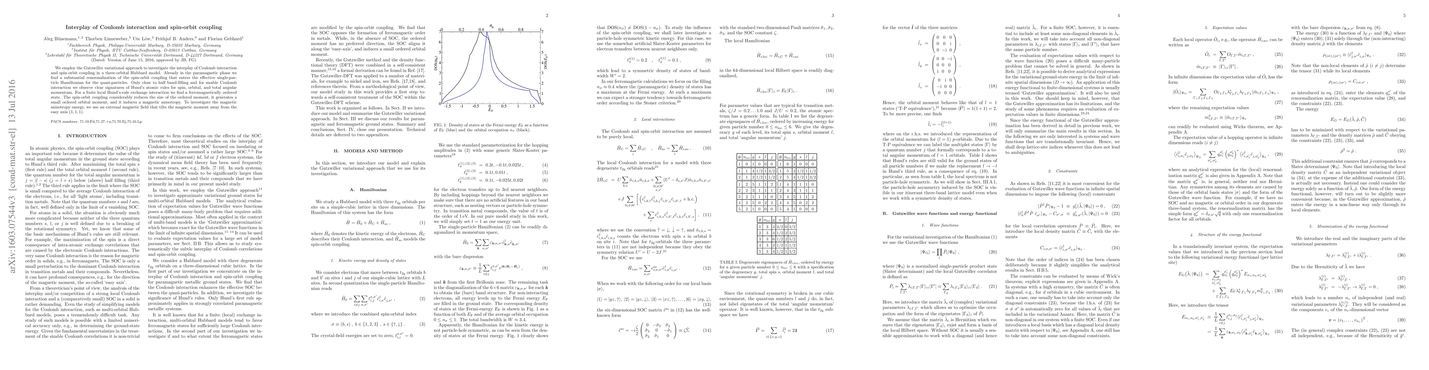 We employ the Gutzwiller variational approach to investigate the interplay of Coulomb interaction and spin-orbit coupling in a three-orbital Hubbard model. Already in the paramagnetic phase we find a substantial renormalization of the spin-orbit coupling that enters the effective single-particle Hamiltonian for the quasi-particles. Only close to half band-filling and for sizable Coulomb interaction we observe clear signatures of Hund's atomic rules for spin, orbital, and total angular momentum. For a finite local Hund's-rule exchange interaction we find a ferromagnetically ordered state. The spin-orbit coupling considerably reduces the size of the ordered moment, it generates a small ordered orbital moment, and it induces a magnetic anisotropy. To investigate the magnetic anisotropy energy, we use an external magnetic field that tilts the magnetic moment away from the easy axis $(1,1,1)$.