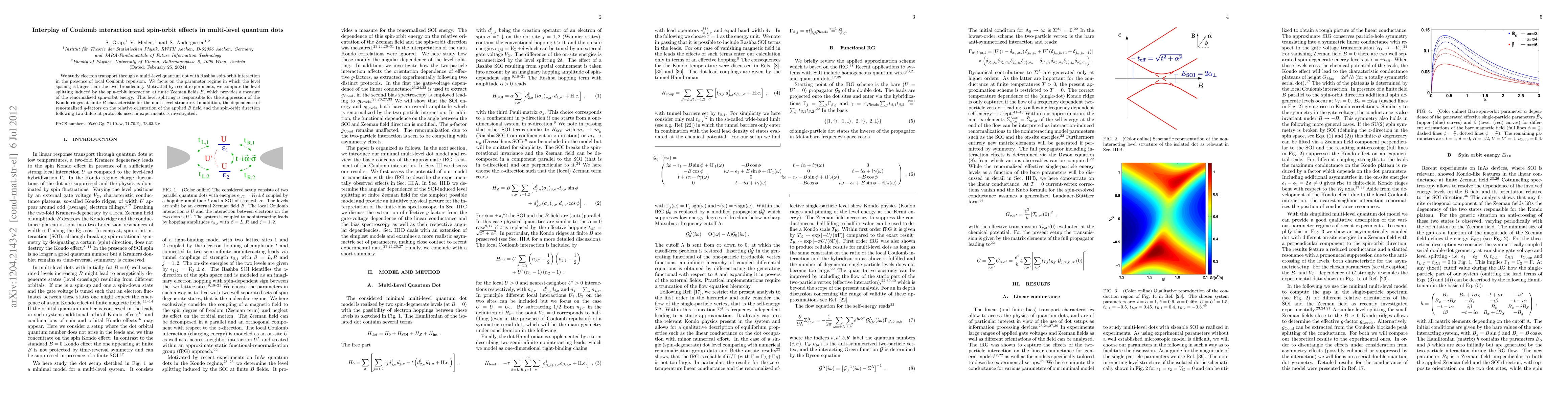 We study electron transport through a multi-level quantum dot with Rashba spin-orbit interaction in the presence of local Coulomb repulsion. Motivated by recent experiments, we compute the level splitting induced by the spin-orbit interaction at finite Zeeman fields $B$, which provides a measure of the renormalized spin-orbit energy. This level splitting is responsible for the suppression of the Kondo ridges at finite $B$ characteristic for the multi-level structure. In addition, the dependence of renormalized $g$-factors on the relative orientation of the applied $B$ field and the spin-orbit direction following two different protocols used in experiments is investigated.